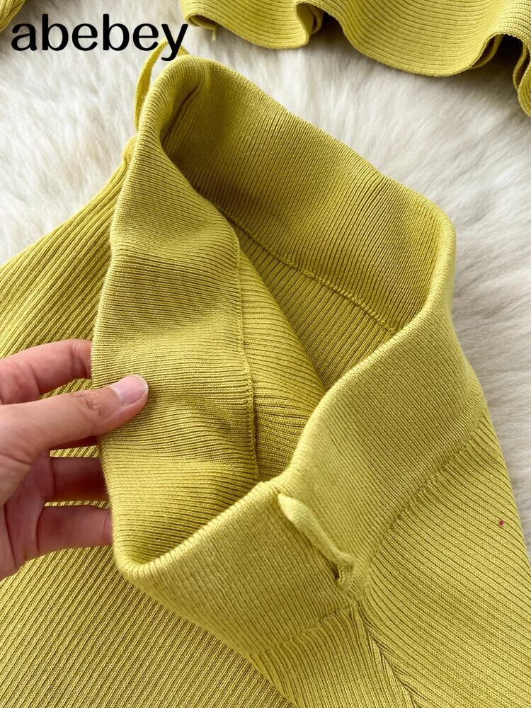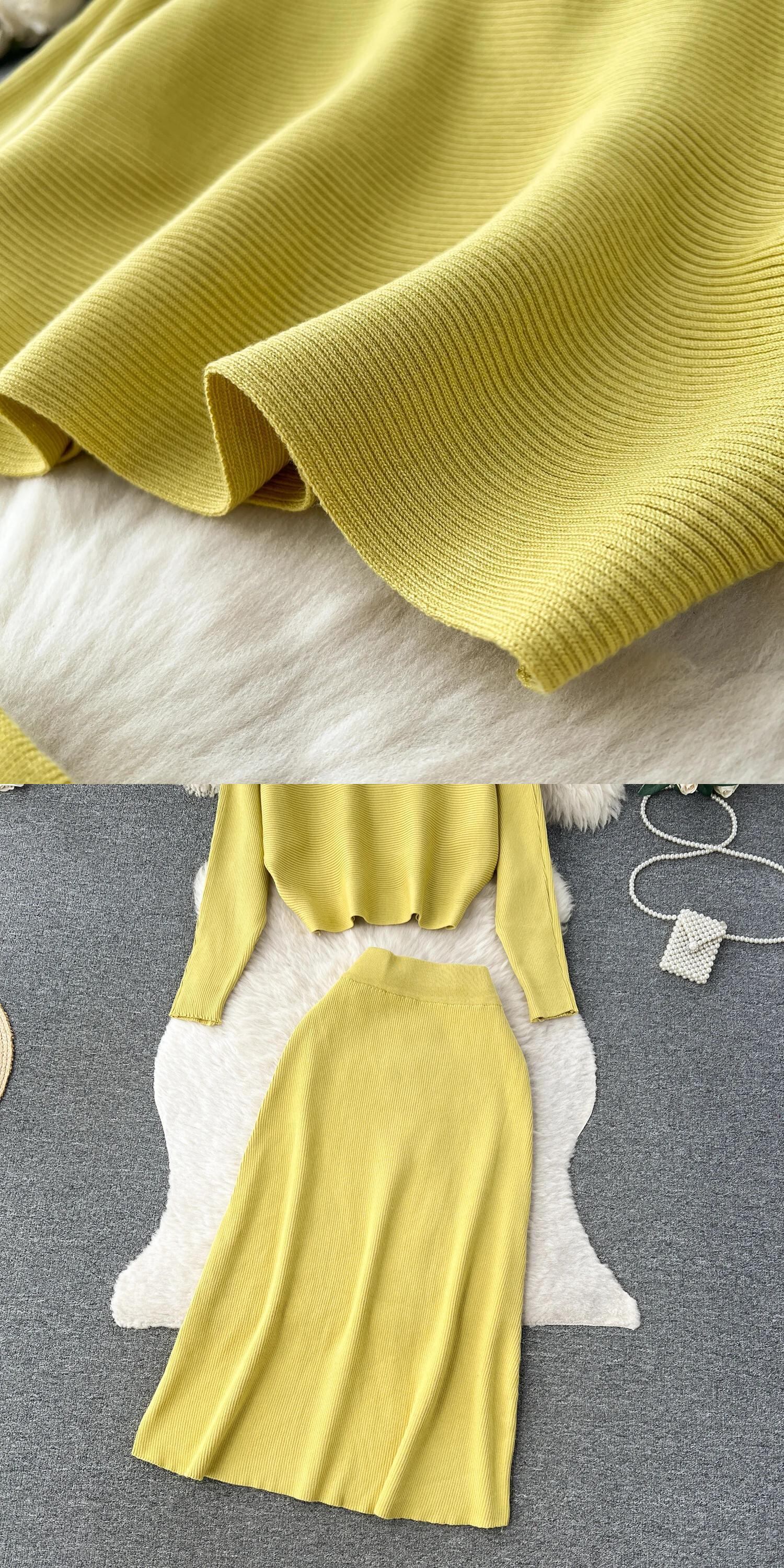 ニットセットスラッシュネックフルスリーブトップ + ストライプボディコンスカート黄色セータースーツ ソリッドカラー