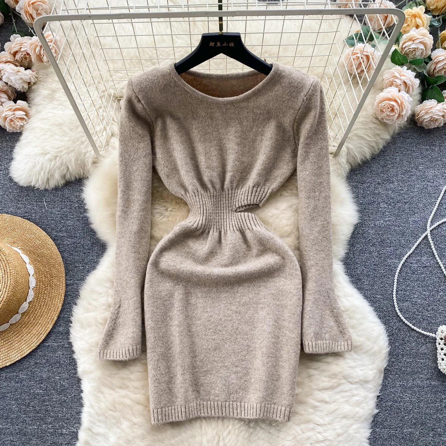 シック O ネック長袖ボディコンドレスセクシーニット弾性スリムヒップラップセータードレス ロング エラスティック 伸縮 Oネック
