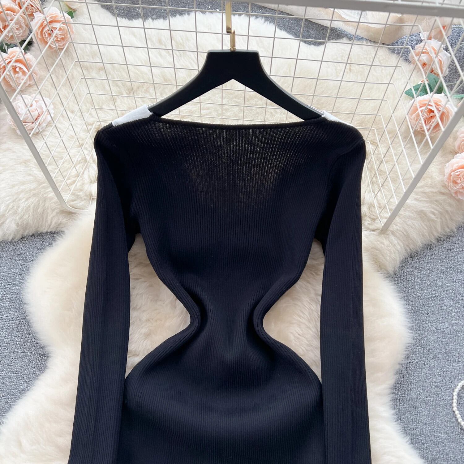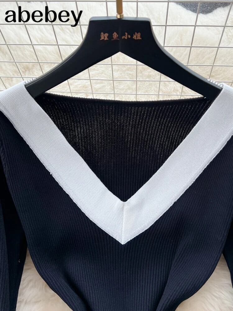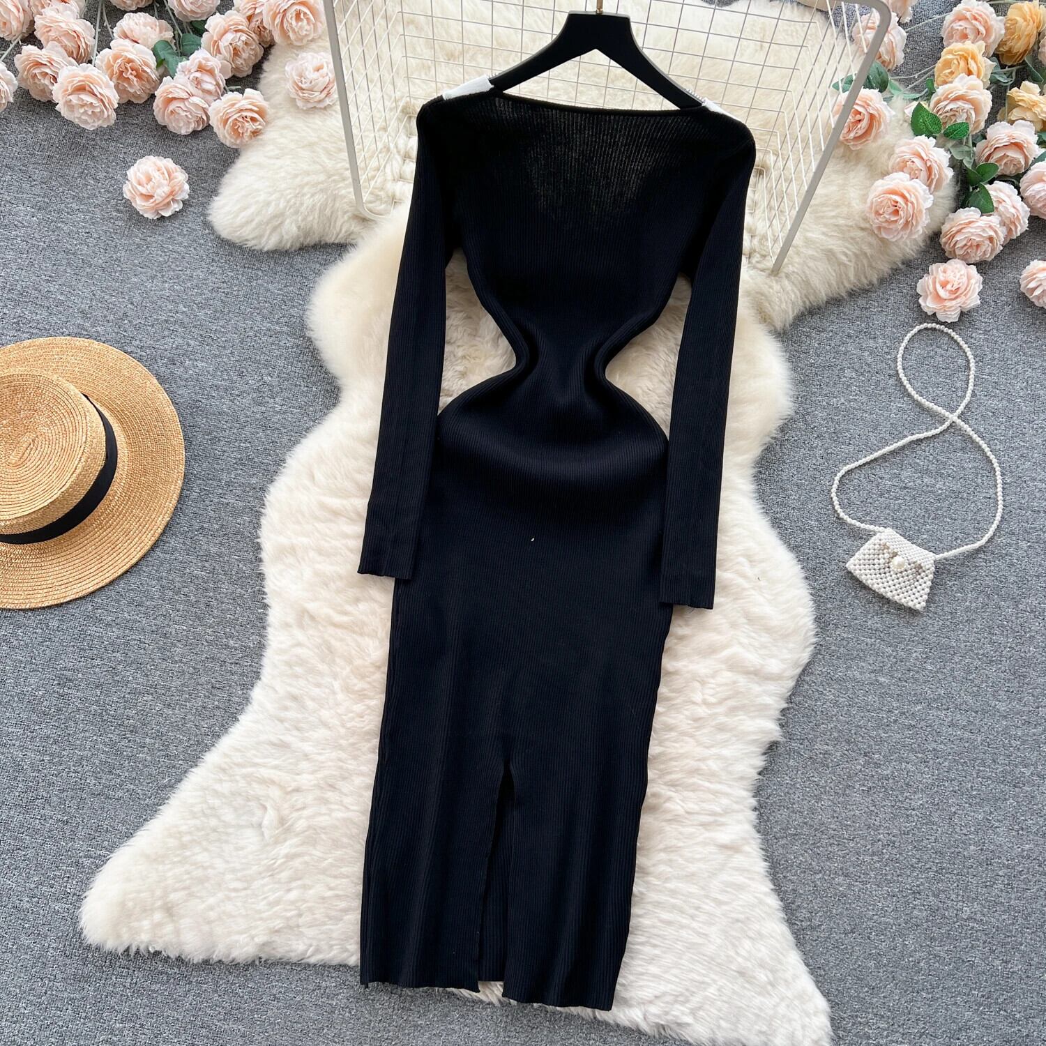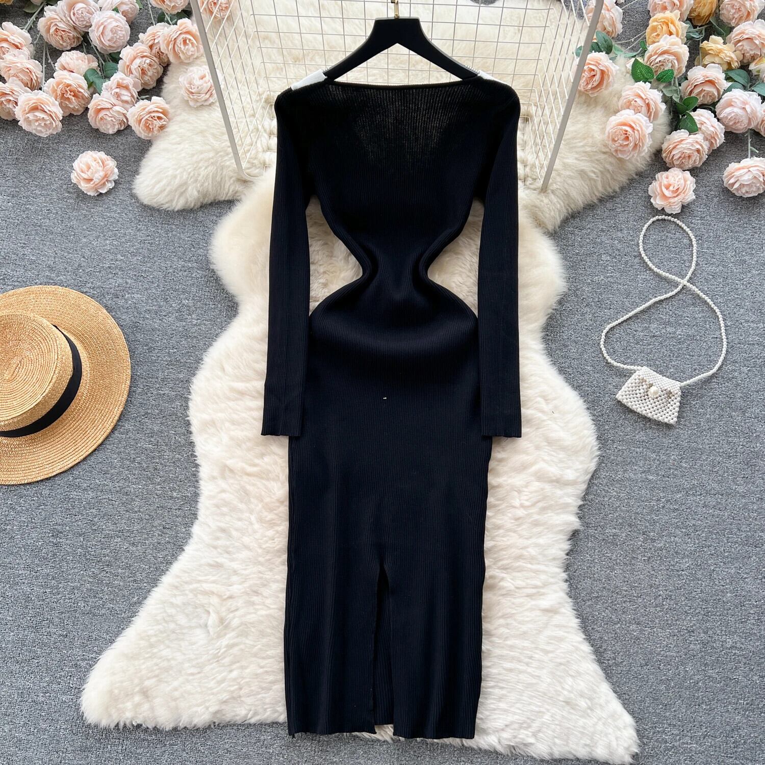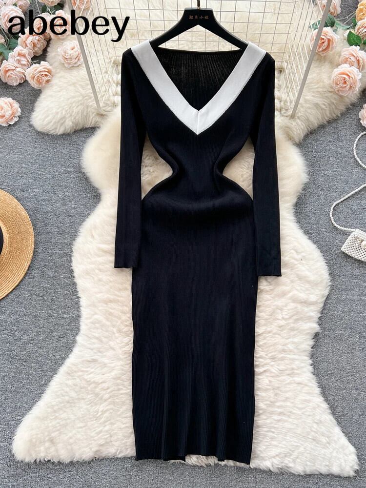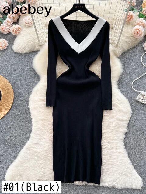 シース秋ドレス V ネック長袖ストリートレトロ厚く暖かいニットセーターマキシロングドレス オータム 秋物 Vネック