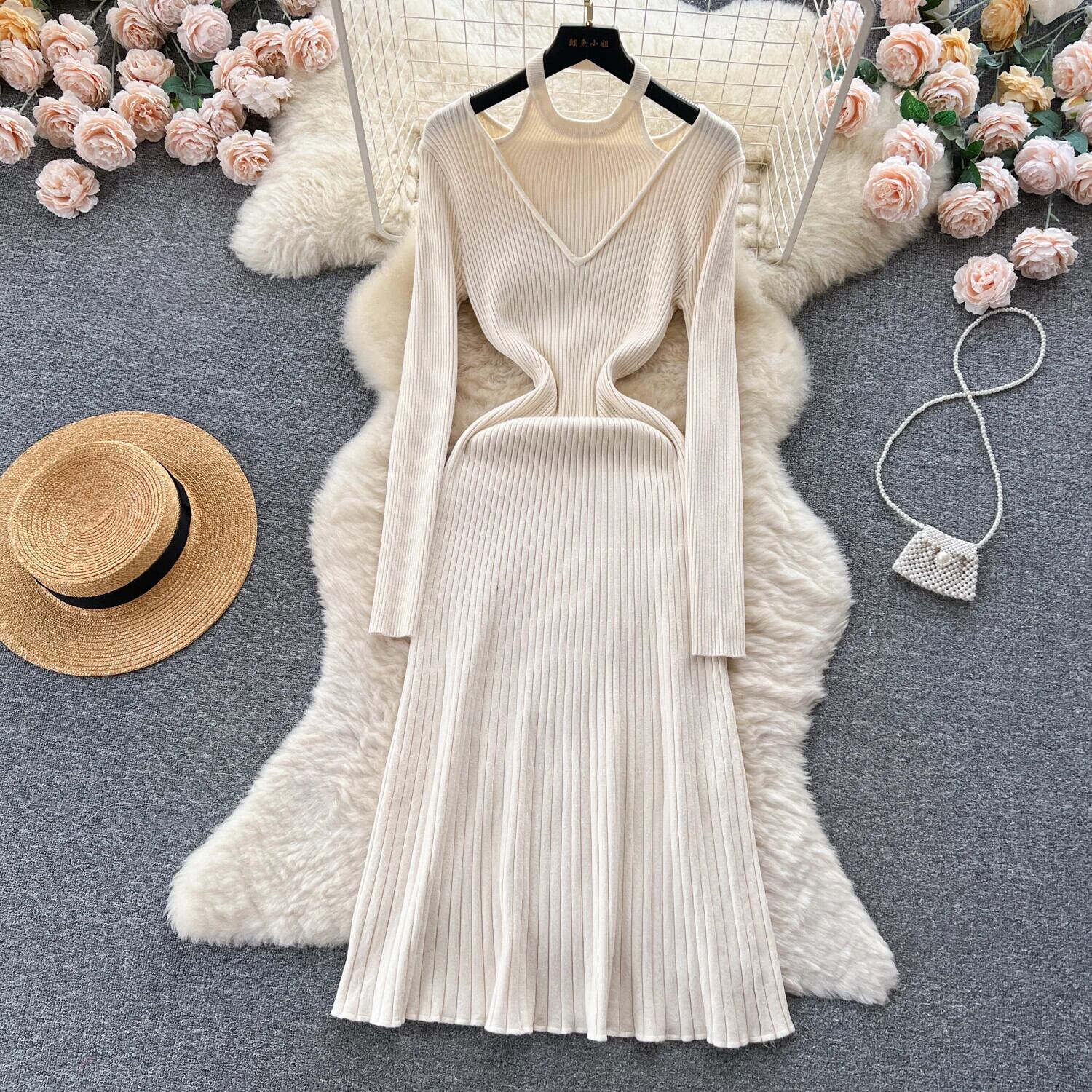 ニット A ラインドレス O ネック長袖スキニー秋フランス優しいストライプパーティードレス ロング オータム 秋物 Oネック Aライン ソリッドカラー