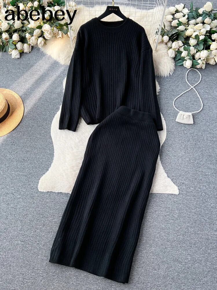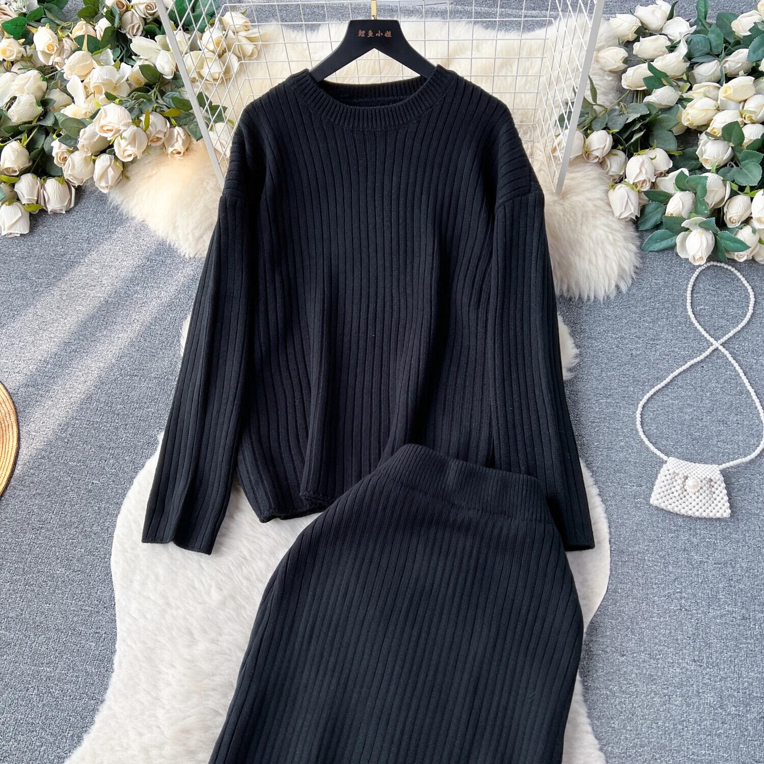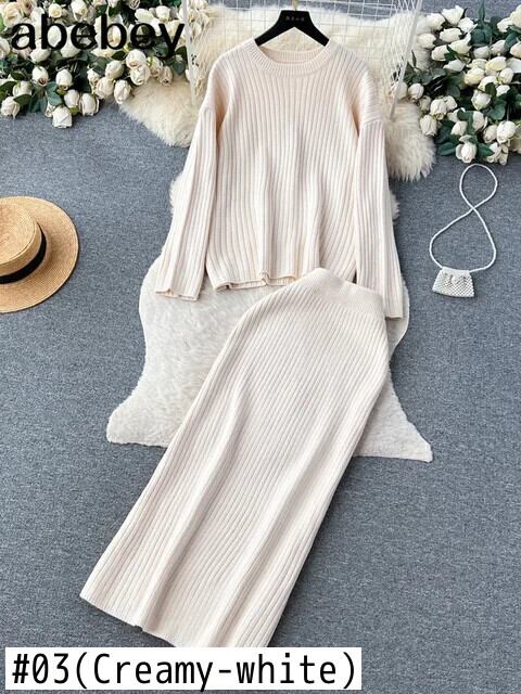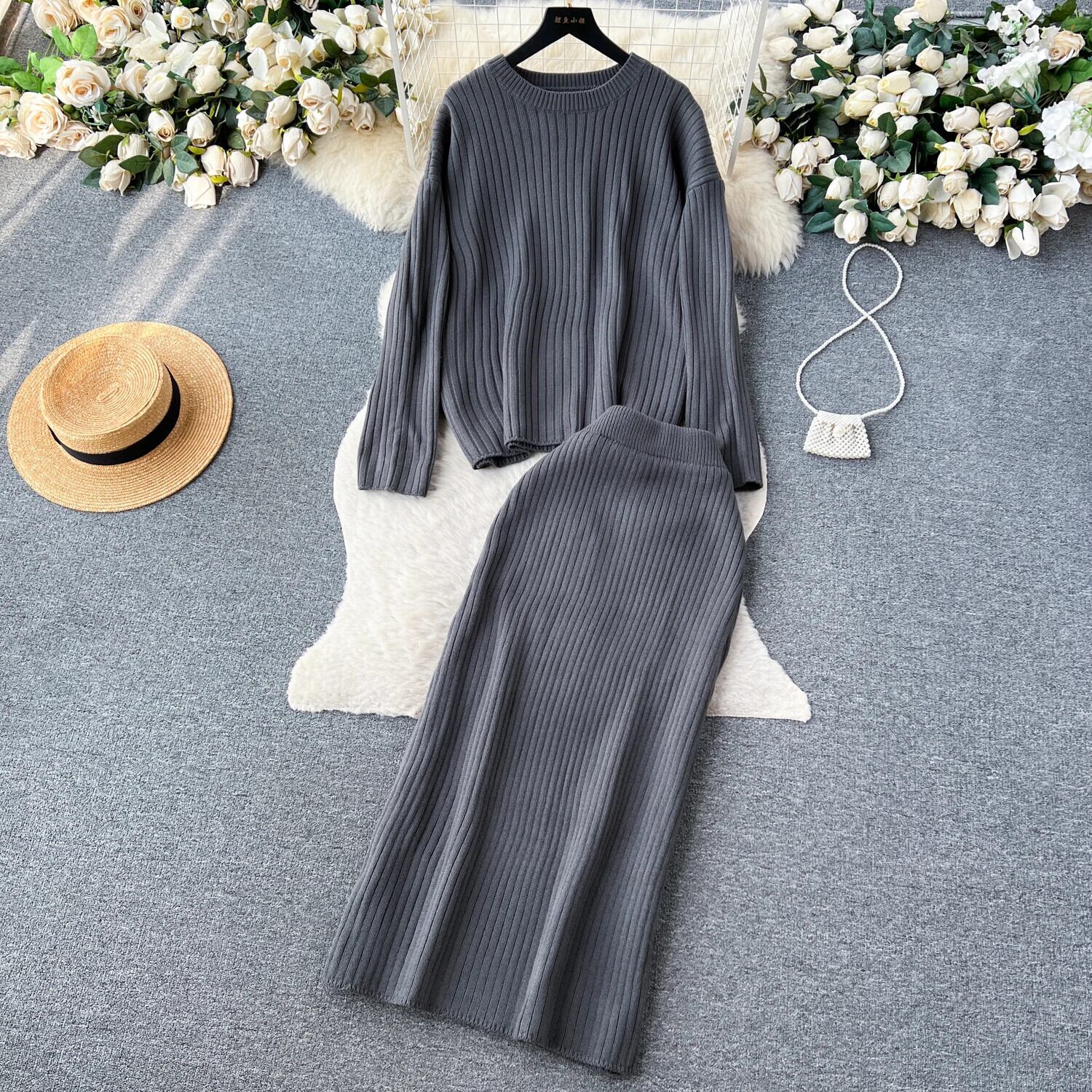 冬ニットスーツストリートプルオーバー + スプリットロングスカートルーズセーター 2 枚セット ウィンター 冬物 ソリッドカラー