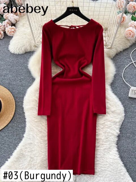 秋ニットロングドレス o ネック長袖弾性ウエストスリム暖かいブラックレススプリットセクシーセータードレス エラスティック 伸縮 オータム 秋物 Oネック