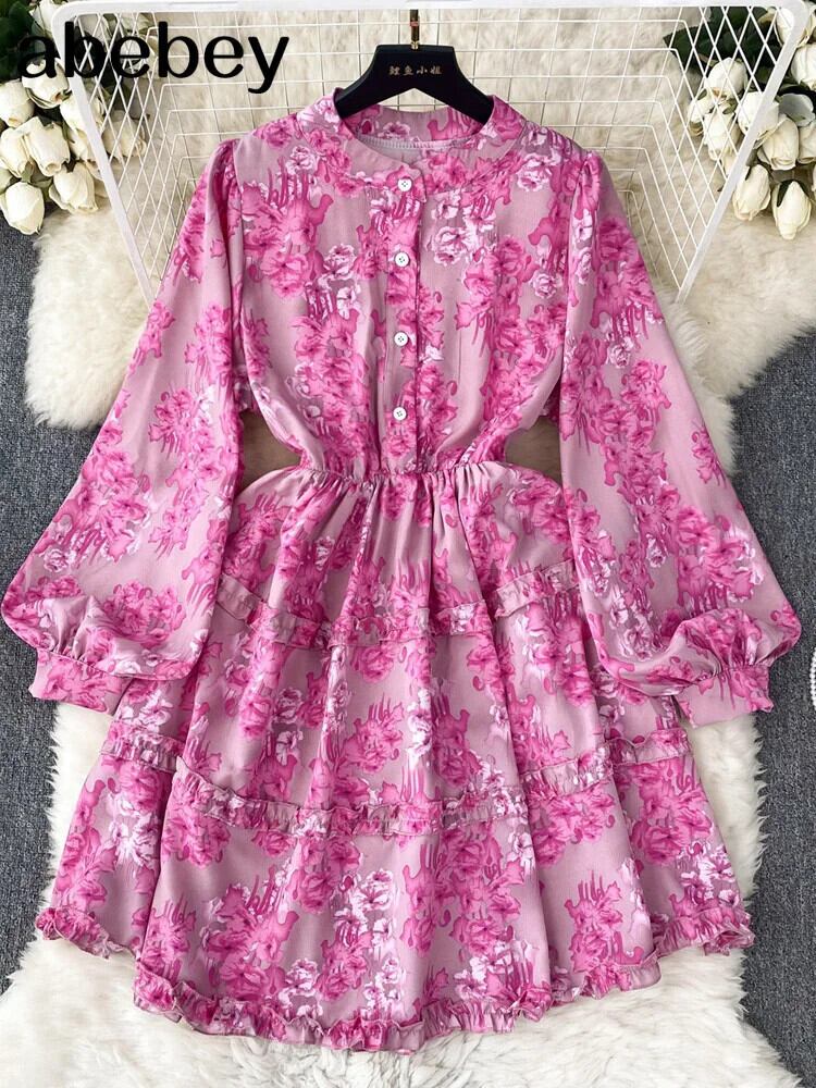 プリントヒットカラードレス O ネックランタン長袖ウエストレースアップちょう結びミニドレス夏 ロング リボン サマー 夏物 Oネック