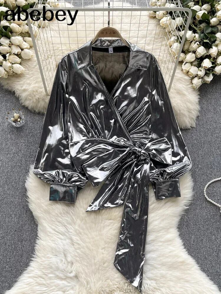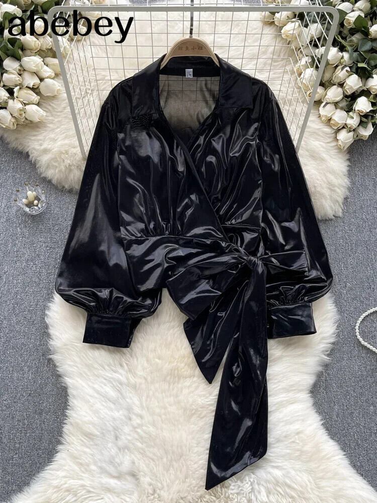 ソリッドカラーシングルブレストベルト飾るスリムシャツラペル長袖トップ ロング ハーネス