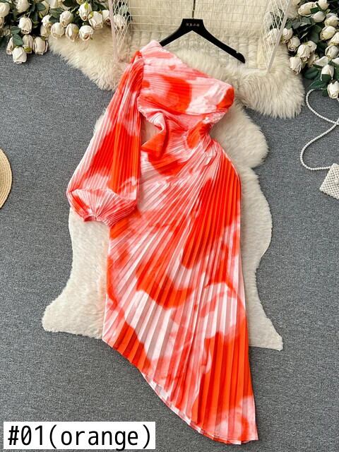 グラデーションプリントプリーツドレスセクシーワンショルダーロールウエストノースリーブシャーリングAラインドレスイブニングローブ