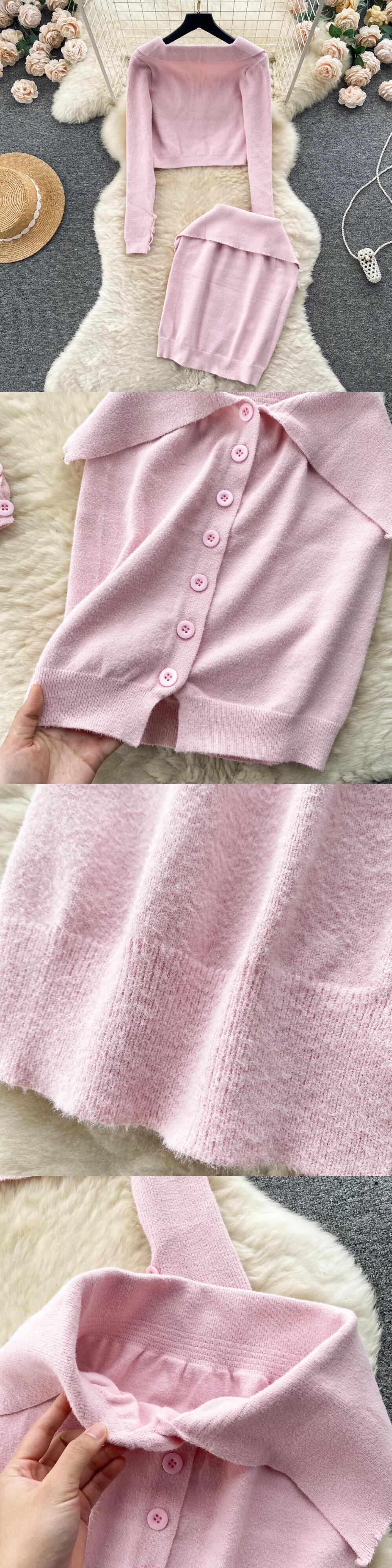 スリムフィットニットスーツ V ネックボタントップス + ウエストミニボディコンスカート秋ストリートスキニーセット オータム 秋物 Vネック