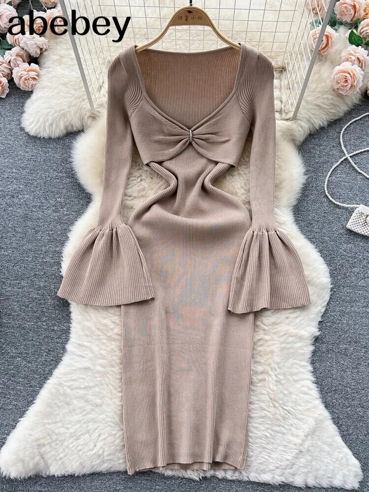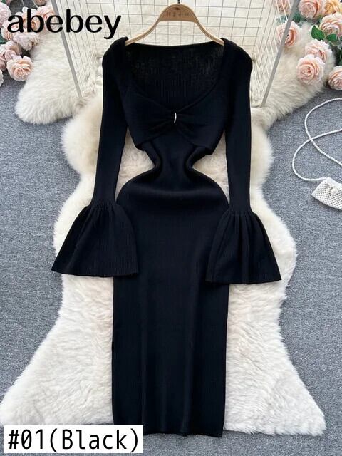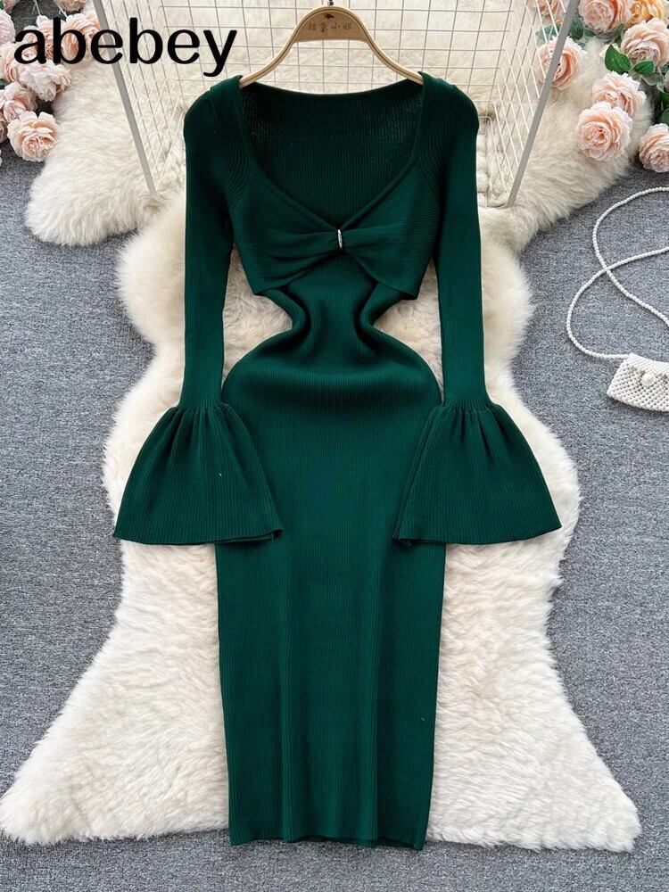 秋セーターボディコンドレス V ネックロングフレアスリーブスリムストライプソリッドニットロングドレス オータム 秋物 Vネック ソリッドカラー