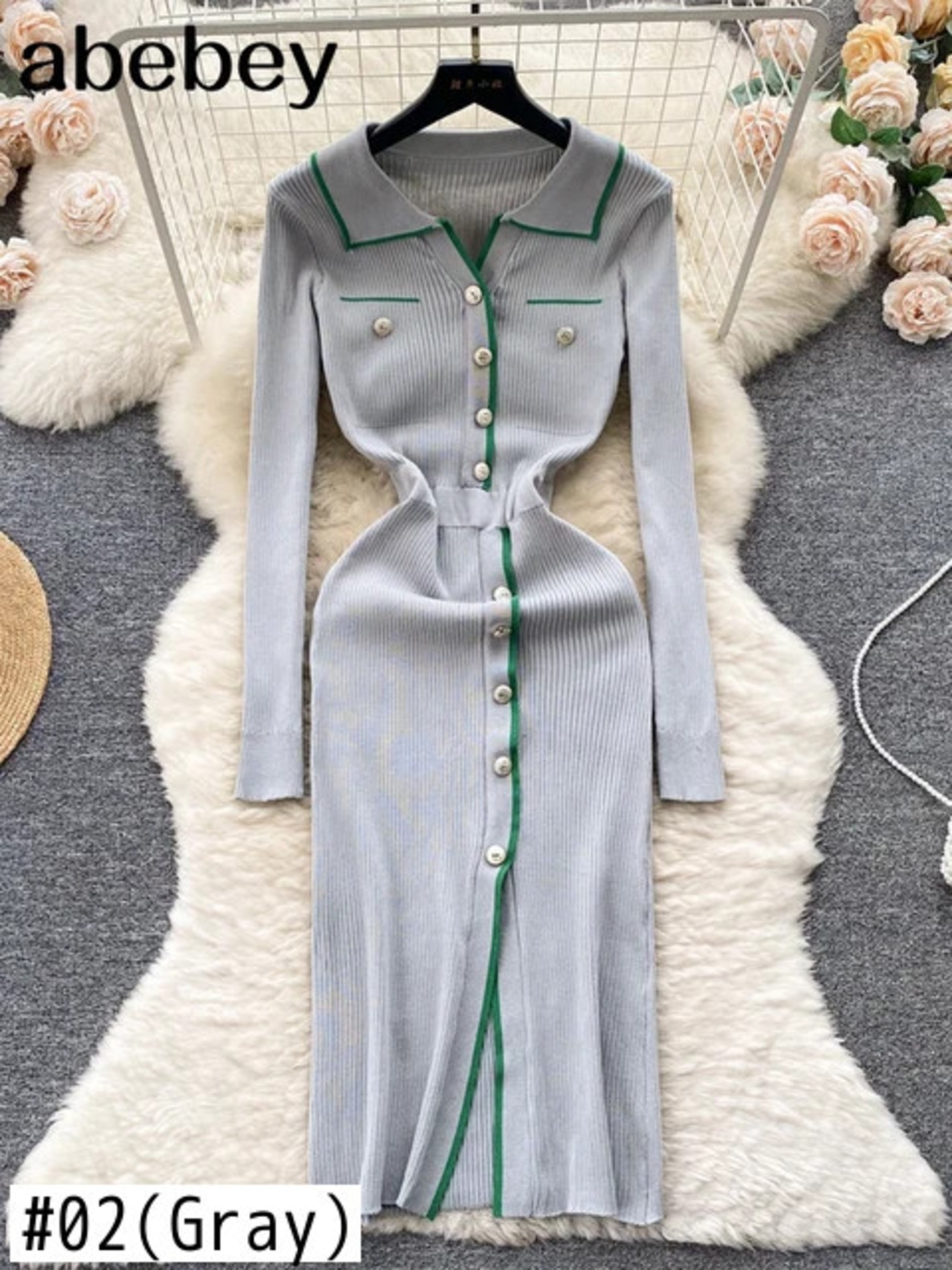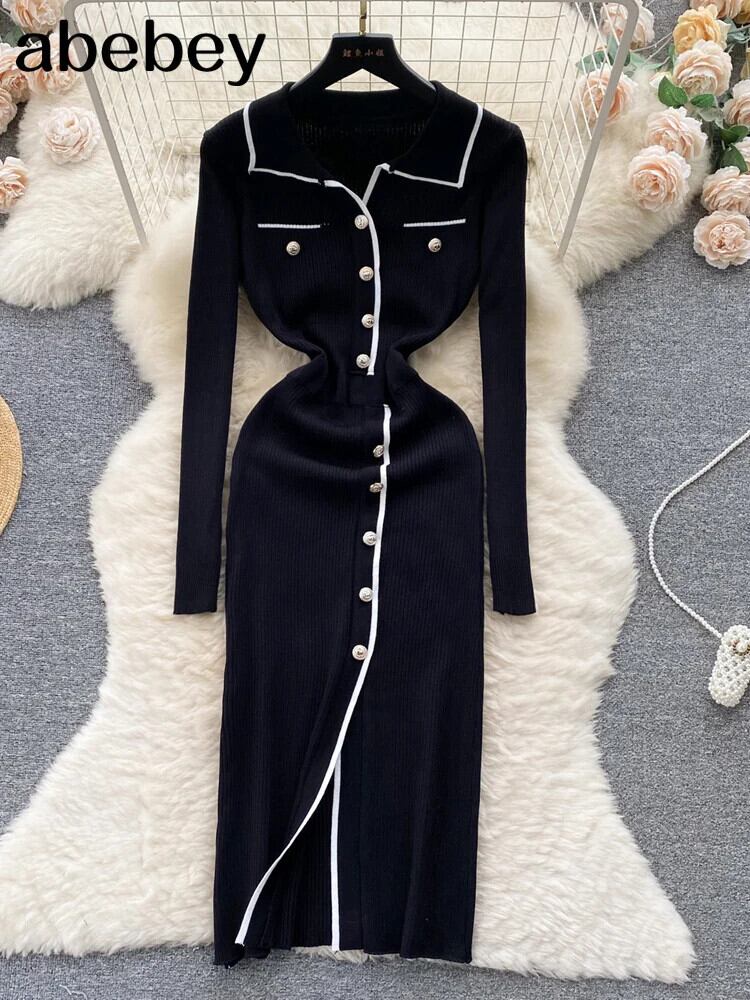 ラペル長袖秋ロングドレスボタンデザインスリムスプリットストリートシースオフィスレディセーターミディドレス オータム 秋物 会社 学校 通勤や通学にも