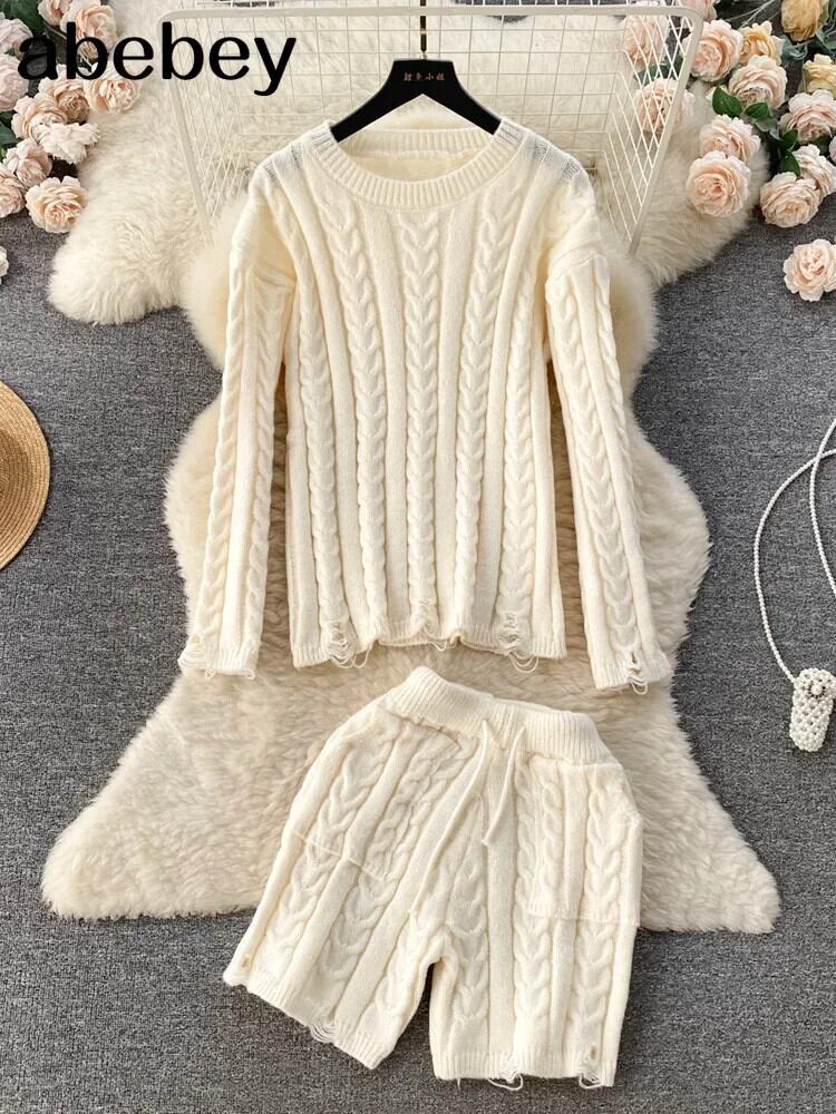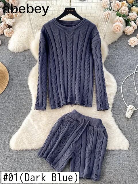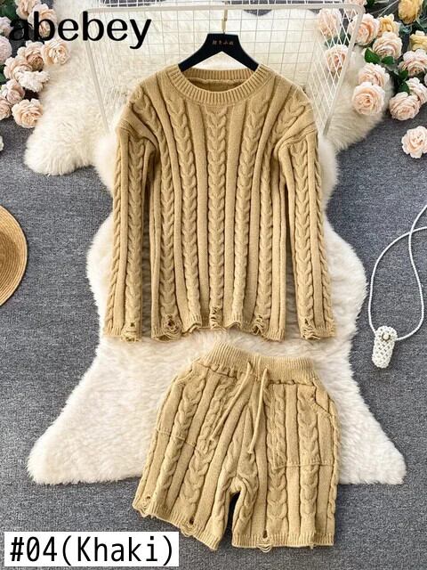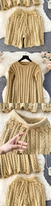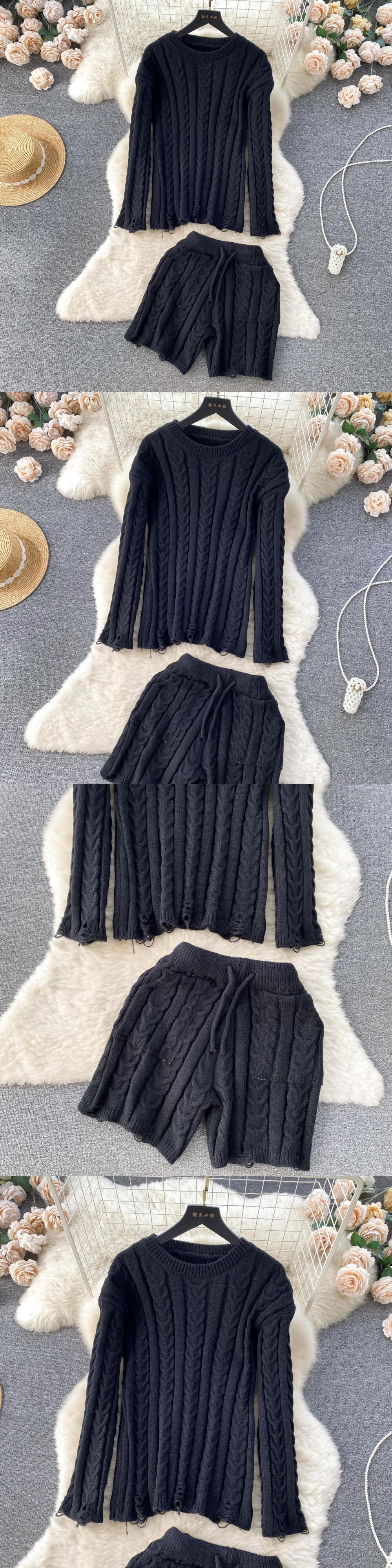 秋ニット 2 枚セットツイスト弾性トップ + 弾性ショーツストリートセーター 2 枚スーツ エラスティック 伸縮 オータム 秋物 ブルマー ソリッドカラー