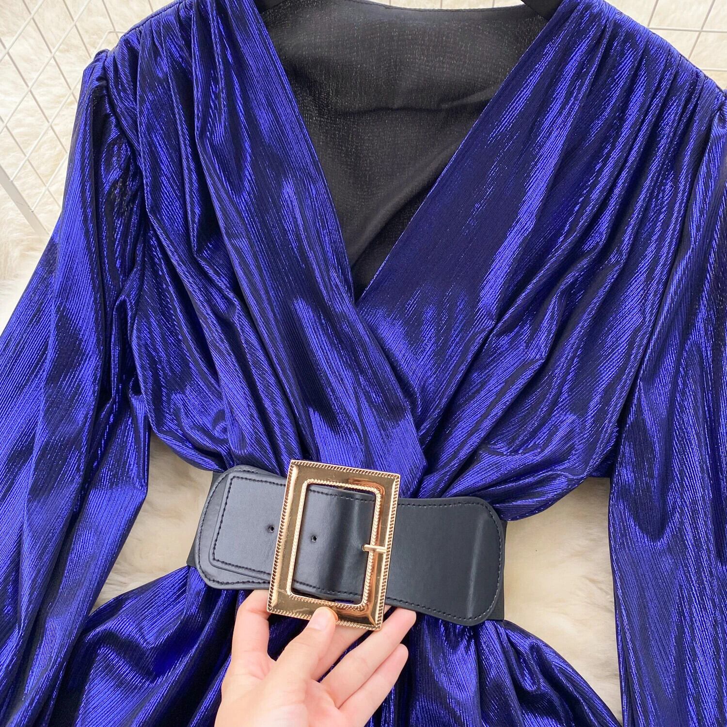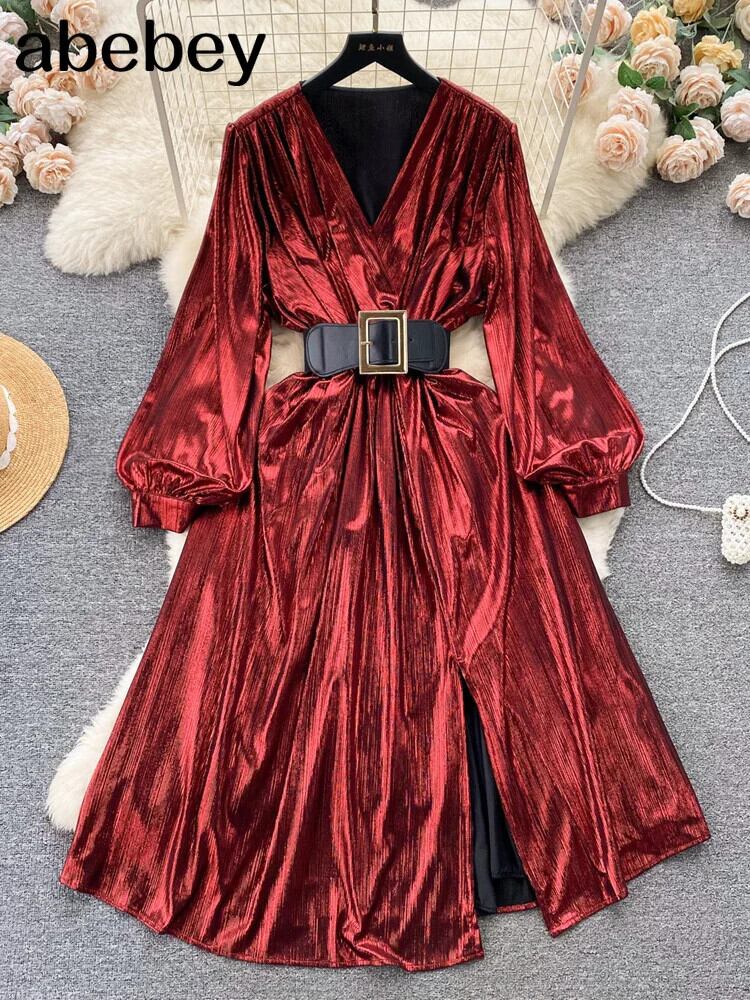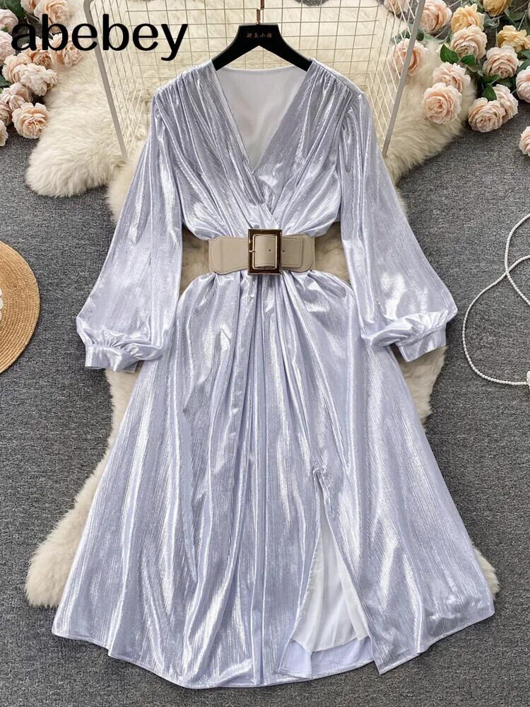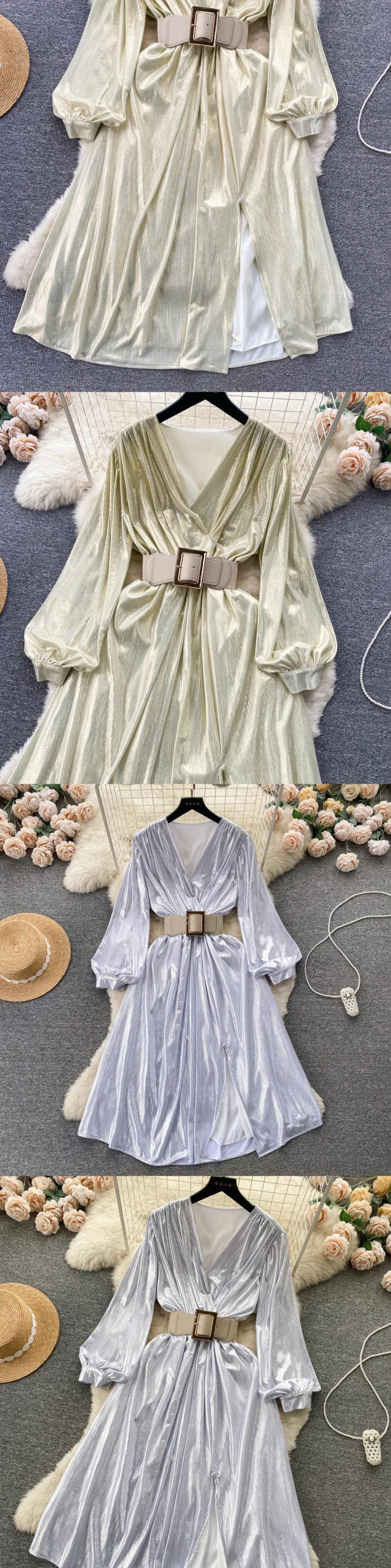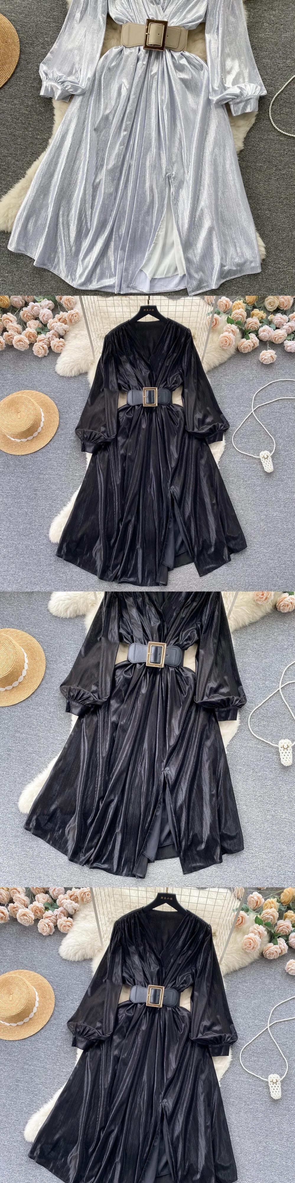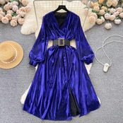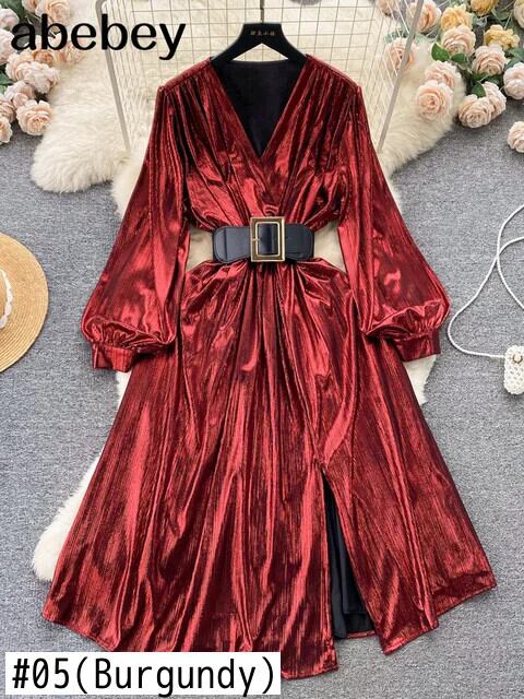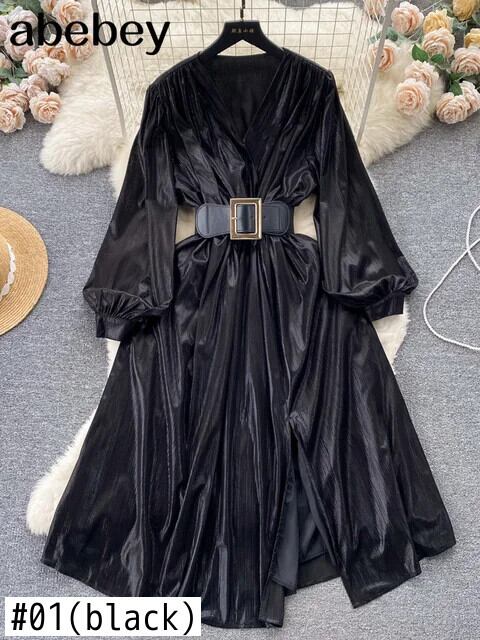 Casaul 春夏ソリッドスリムフルレディドレス A ライン V ネックシフォンプルオーバーミッドカーフウエストドレス スプリング 春物 サマー 夏物 Vネック Aライン ソリッドカラー