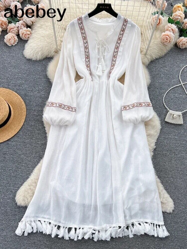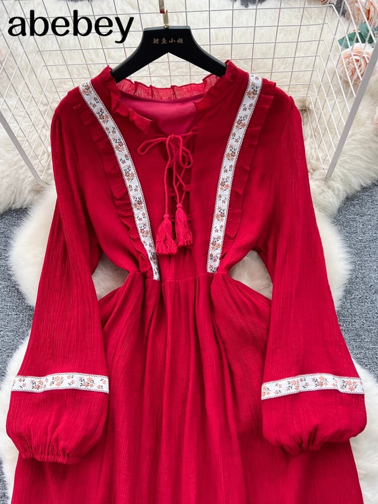 秋 Vestidos ボヘミアン休暇スタイルニッチ感覚ルーズバインディング薄い妖精気質電話ドレス オータム 秋物