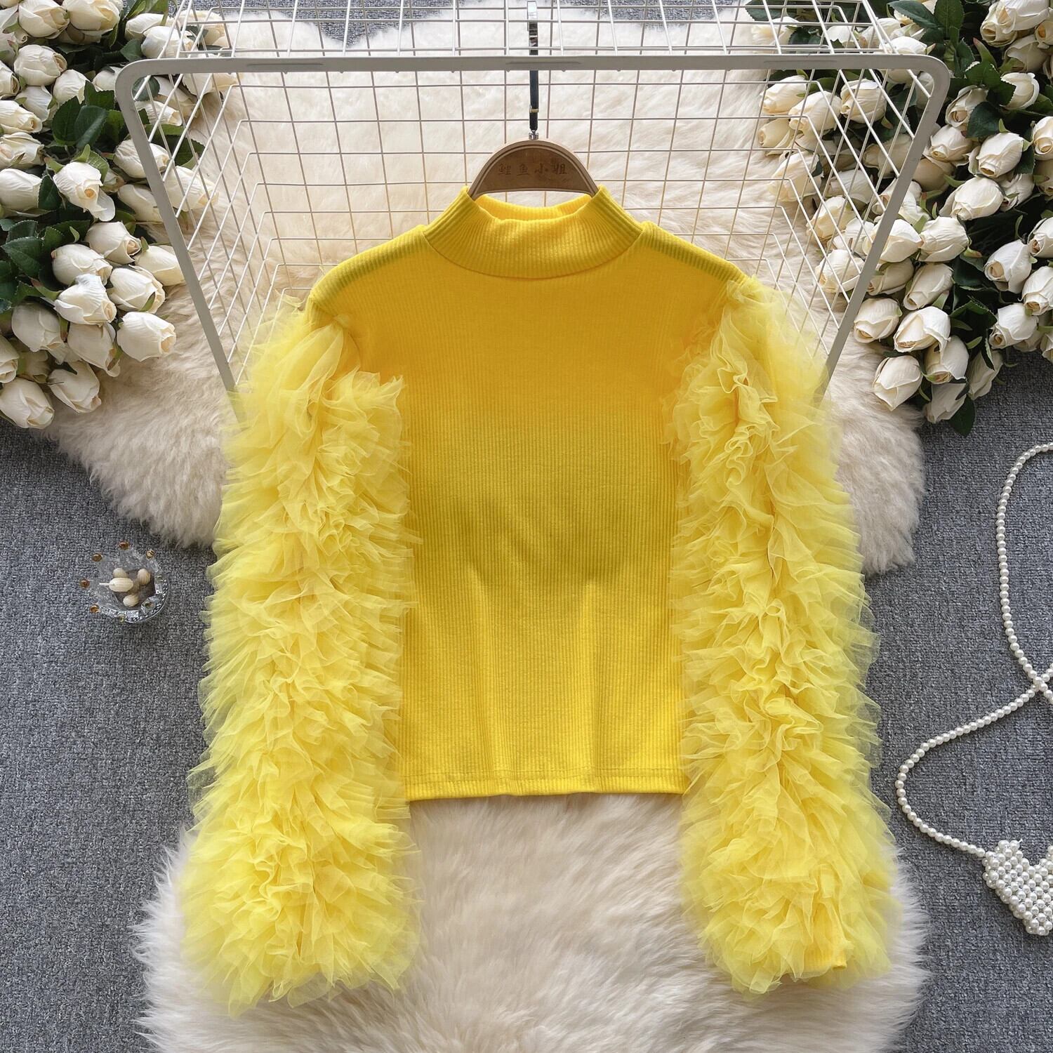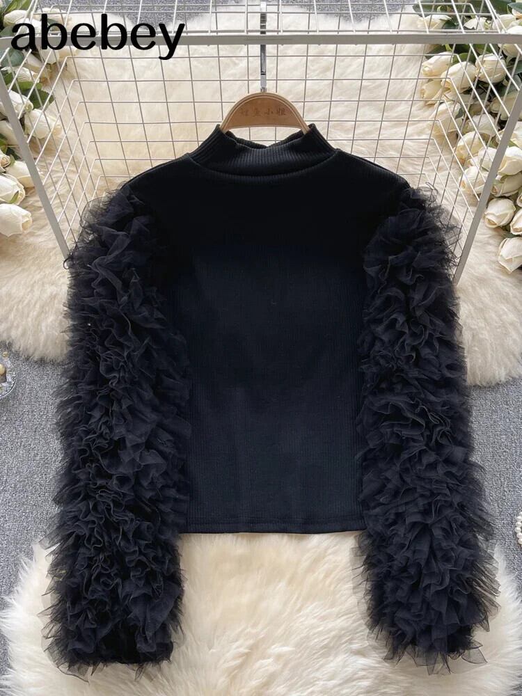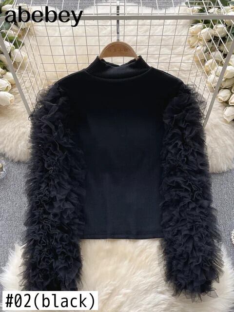 メッシュ長袖パッチワーク O ネックニットプルオーバーセーター秋ニットトップス ロング オータム 秋物 Oネック