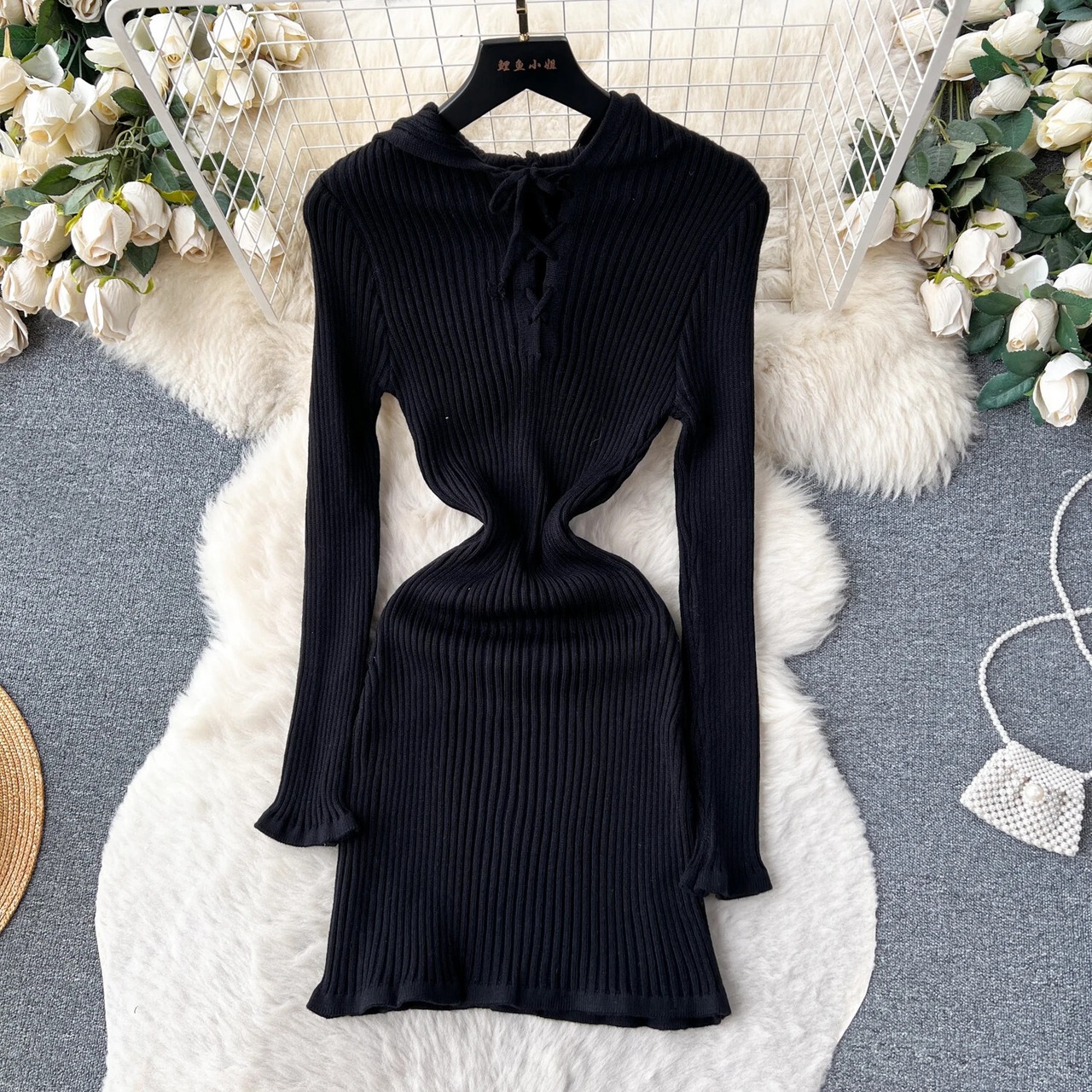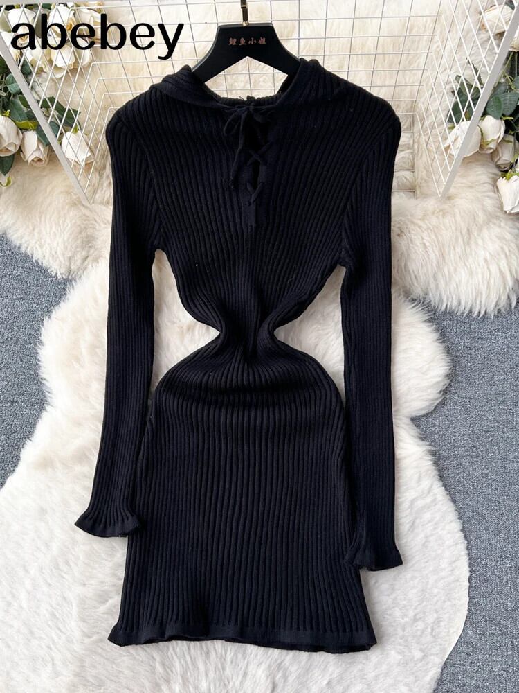パーカーニットドレス Corss レースアップ弓アウト長袖スリムフィット秋セーターミディドレス ロング リボン オータム 秋物 ソリッドカラー