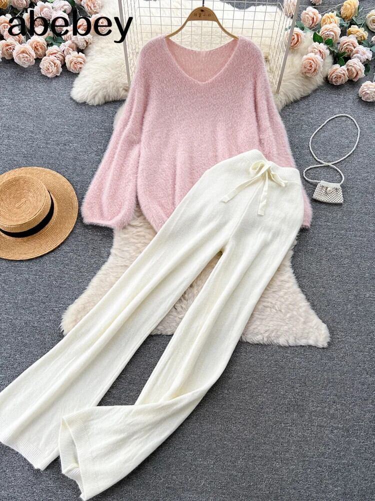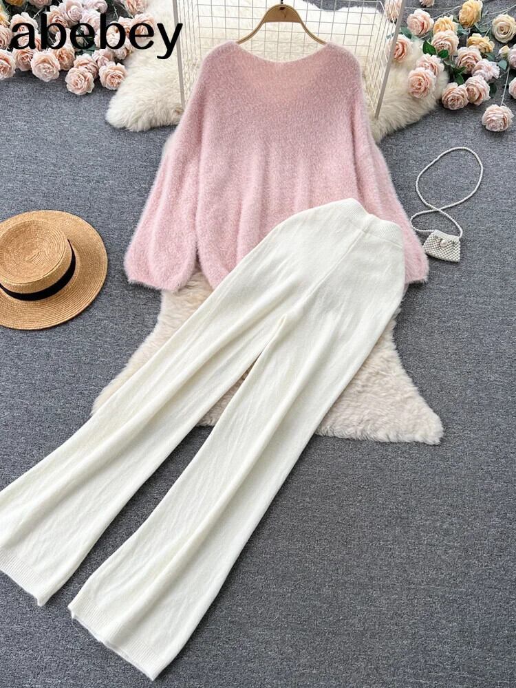春と秋ツーピースセット長袖ニットセーター+ウエストゴムワイドレッグパンツレディースルーズセーターセット ロング エラスティック 伸縮 スプリング 春物 オータム 秋物 ワイドパンツ