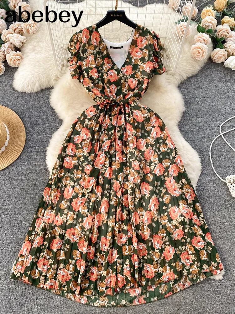 夏花プリーツロングドレス V ネックフリルドレープマキシ Vestidos 休暇ビーチローブ サマー 夏物 花柄 Vネック