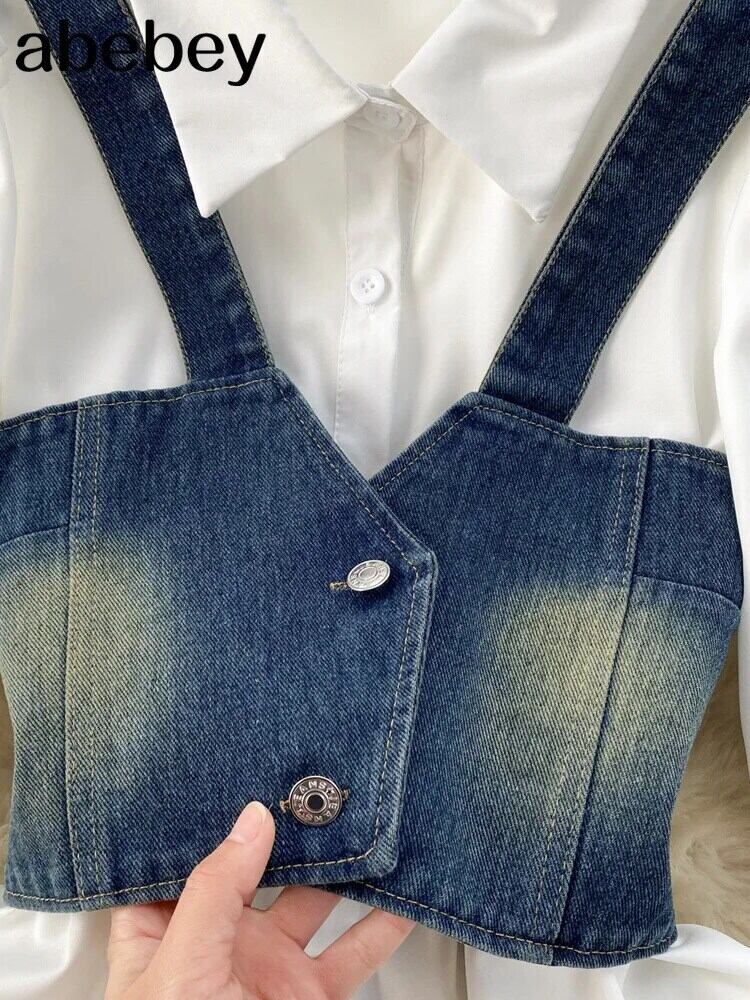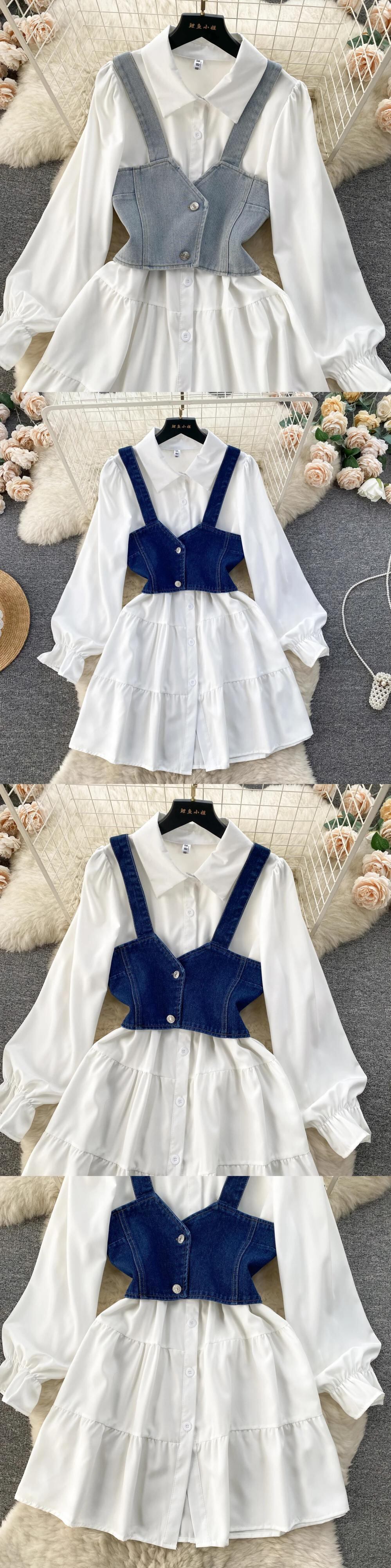 春秋カウボーイチョッキシャツドレス丈袖白シャツドレスベストレディースツーピースセット ホワイト スプリング 春物 オータム 秋物
