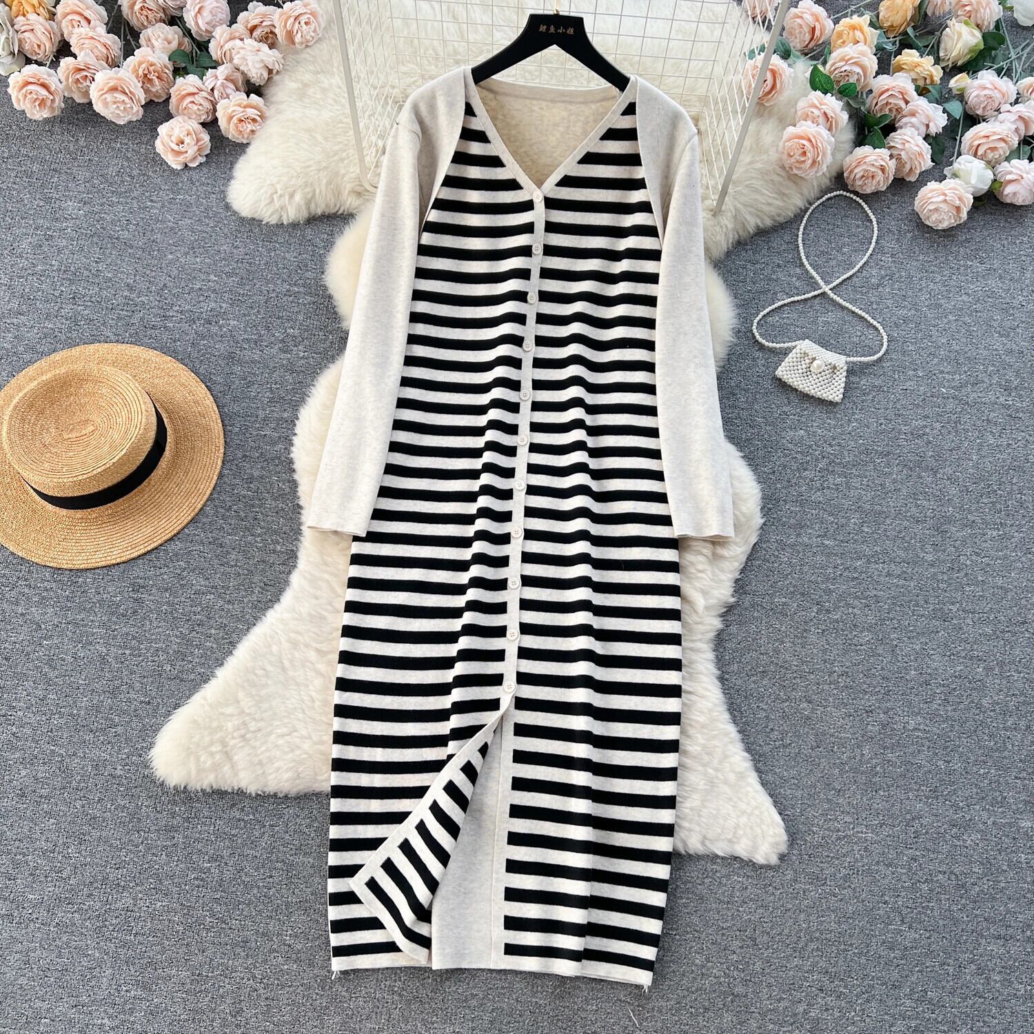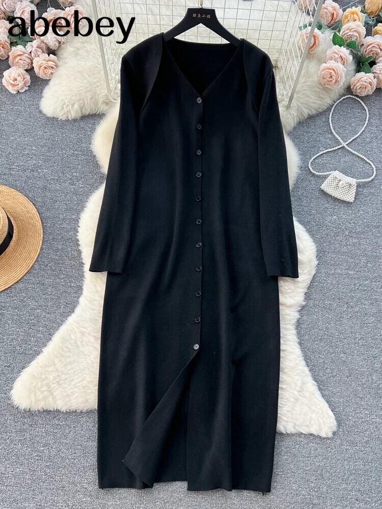 秋冬 v ネックストレートセータードレスシックオーバーサイズルーズニットドレスロングドレスシックセーター maixt ドレス オータム 秋物 ウィンター 冬物 Vネック