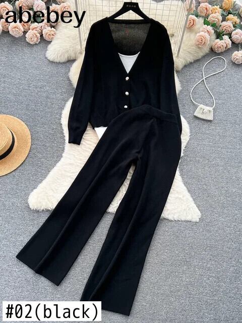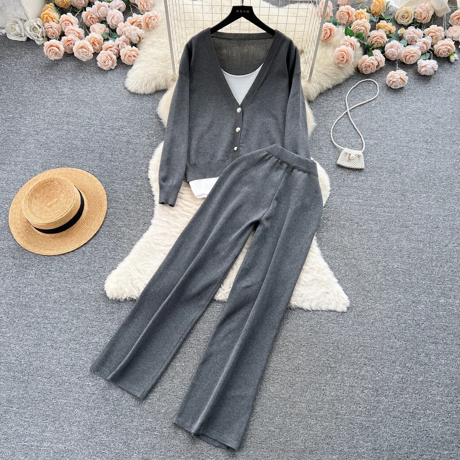 スタイルスポーティスーツ V ネックストライプルーズカーディガン + ワイドレッグパンツ冬セット ウィンター 冬物 Vネック ワイドパンツ ソリッドカラー