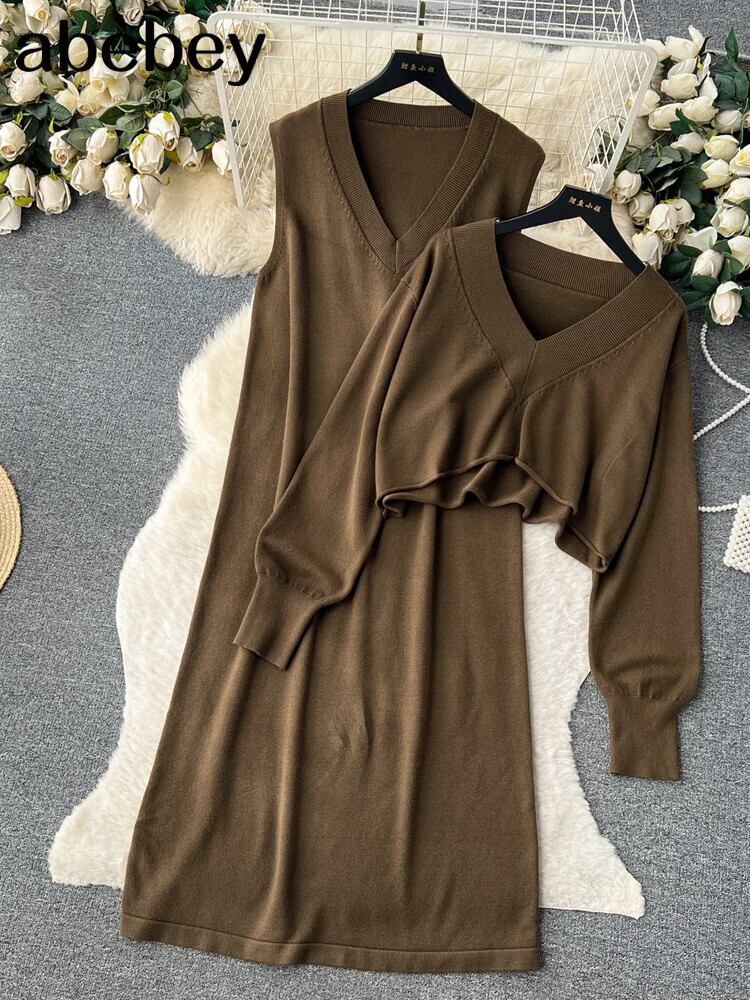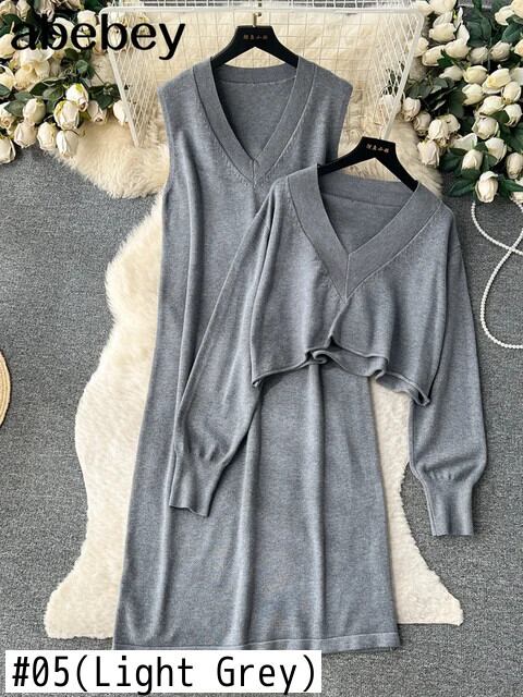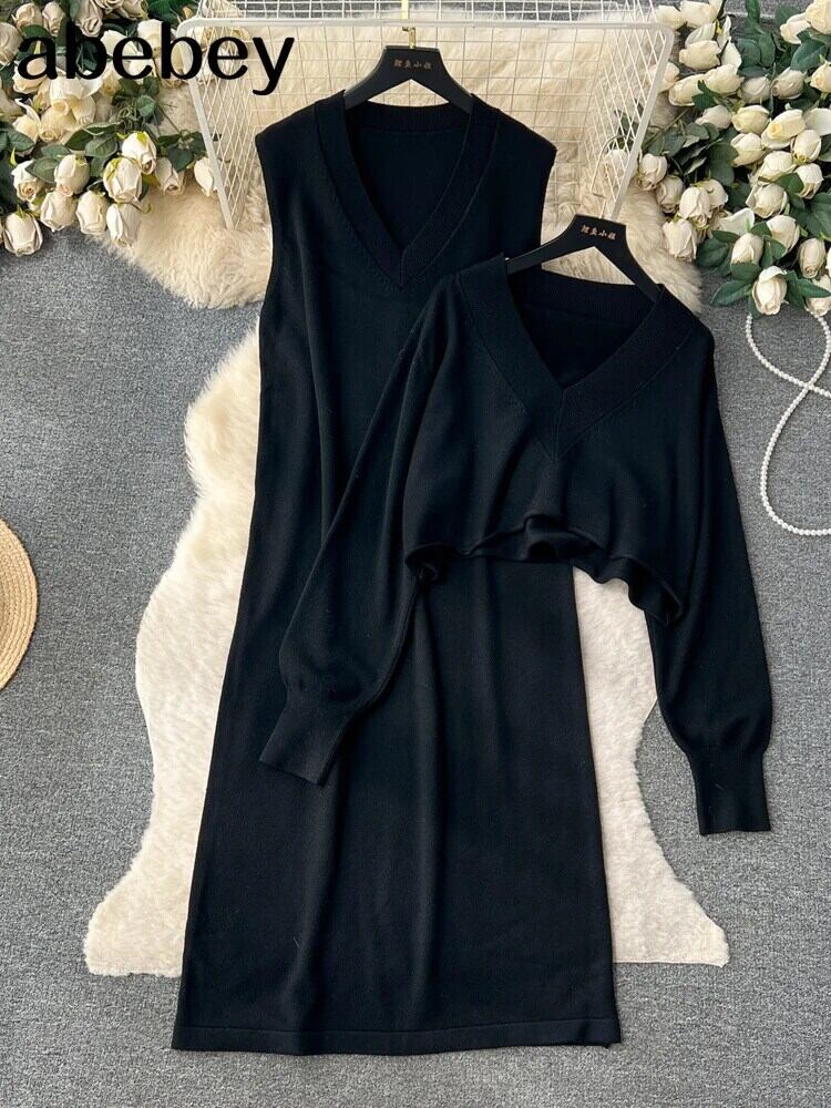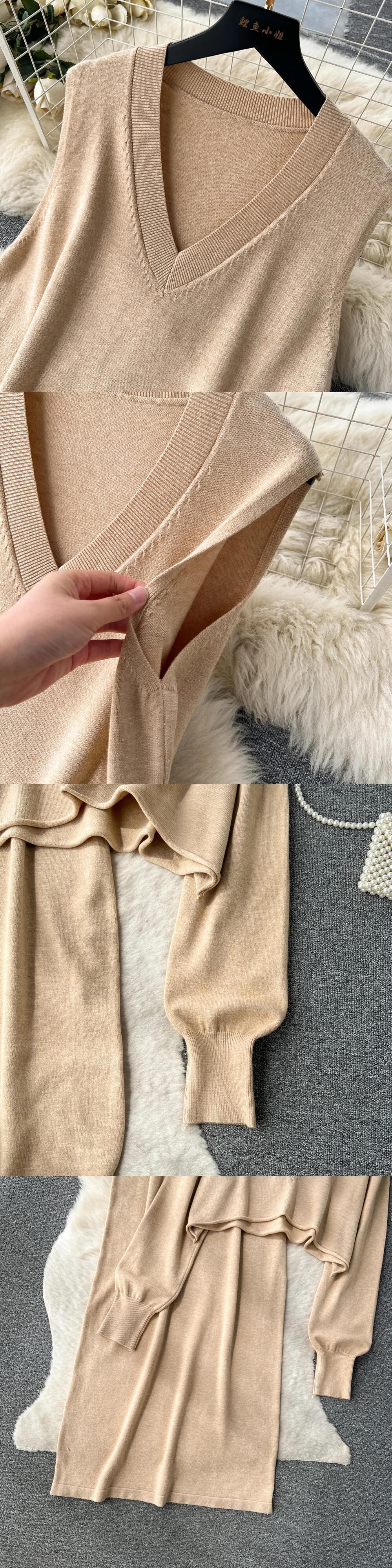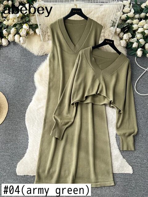ニットスーツセータープルオーバークロップトップ+Vネックタンクボディコンミディロングドレススタイル秋セット オータム 秋物 ソリッドカラー
