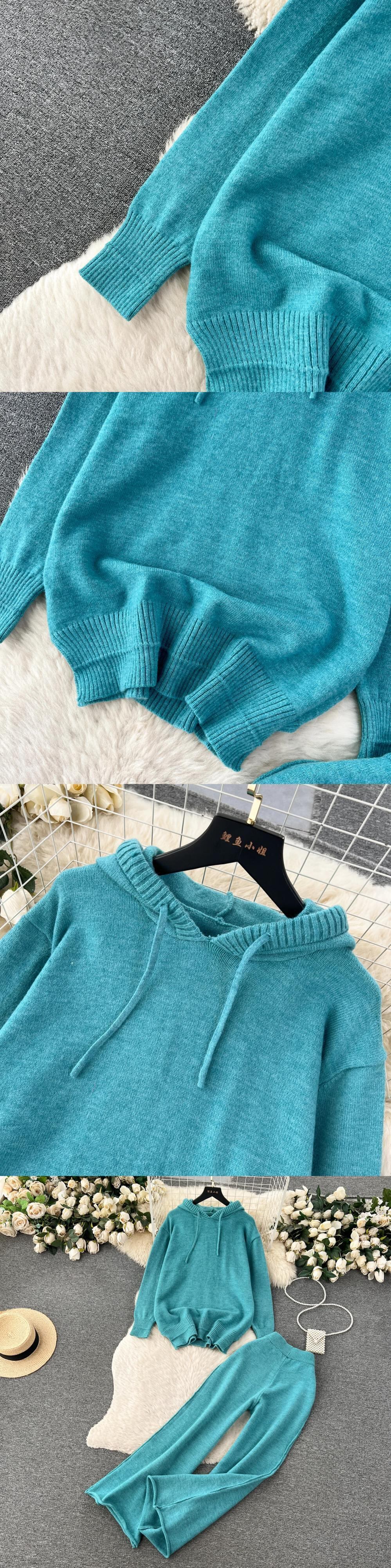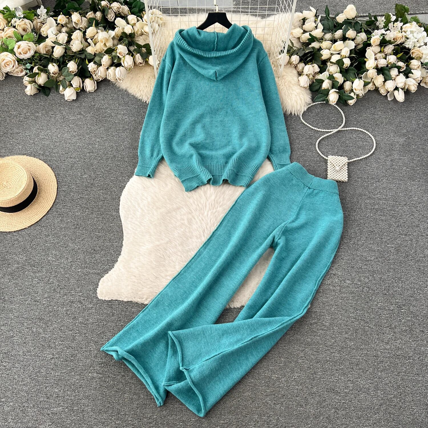 ニットキャロットパンツ 2 点セットソリッドクロップドフード付きセーター + ワイドレッグパンツツーピースジャージ ワイドパンツ ソリッドカラー