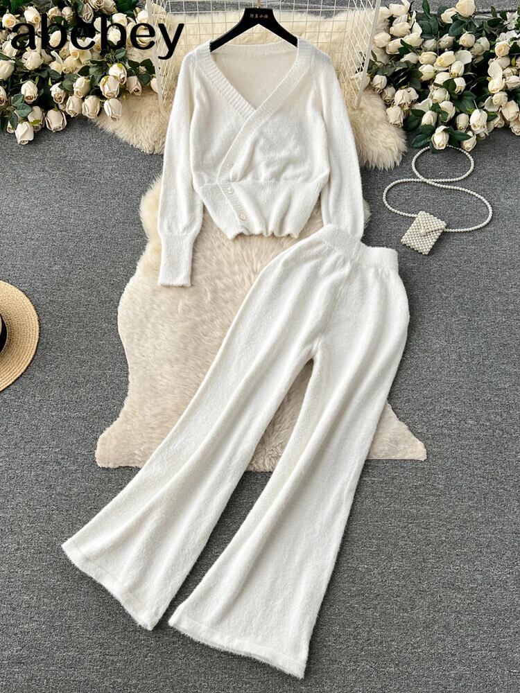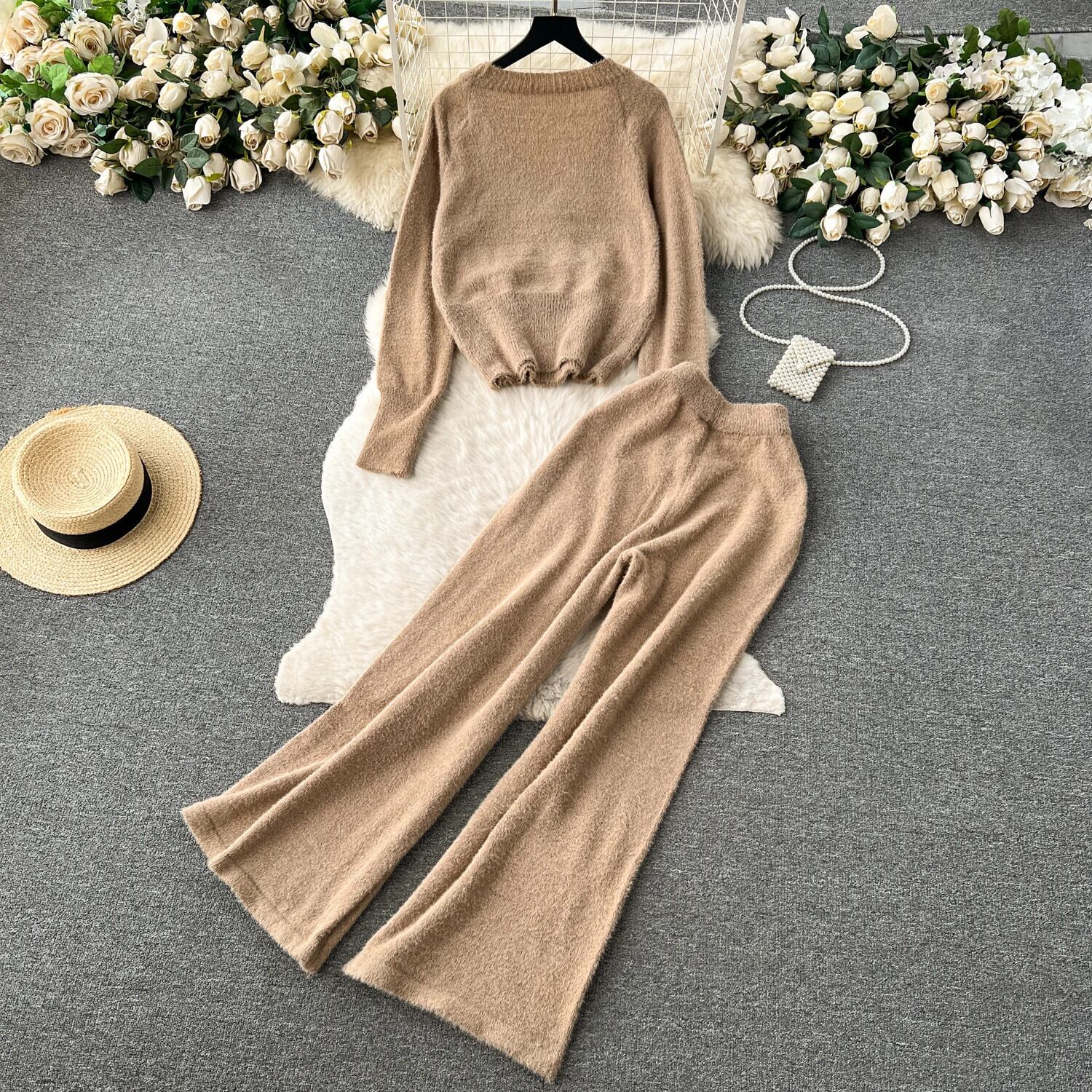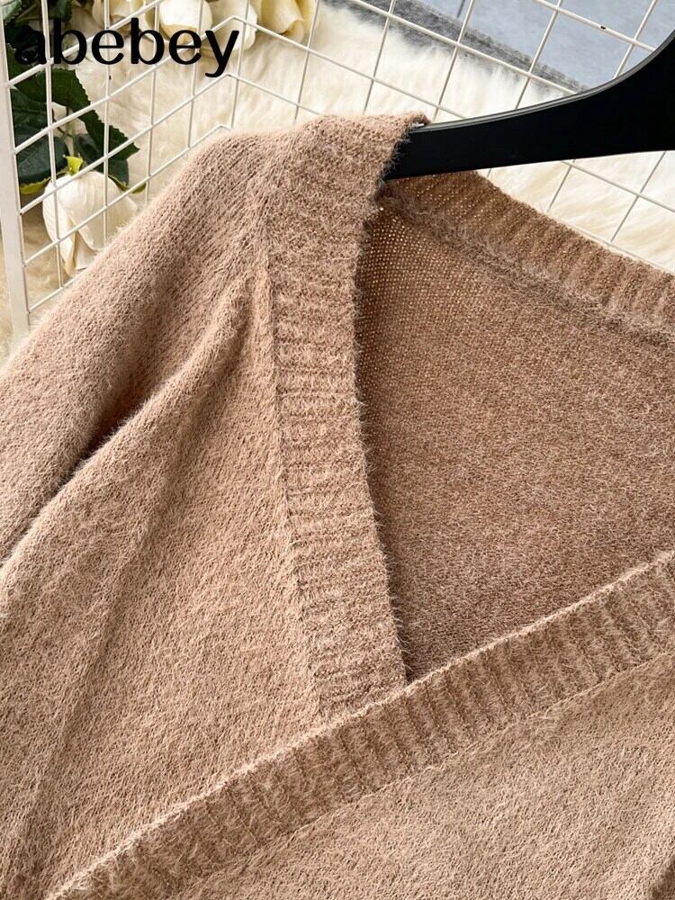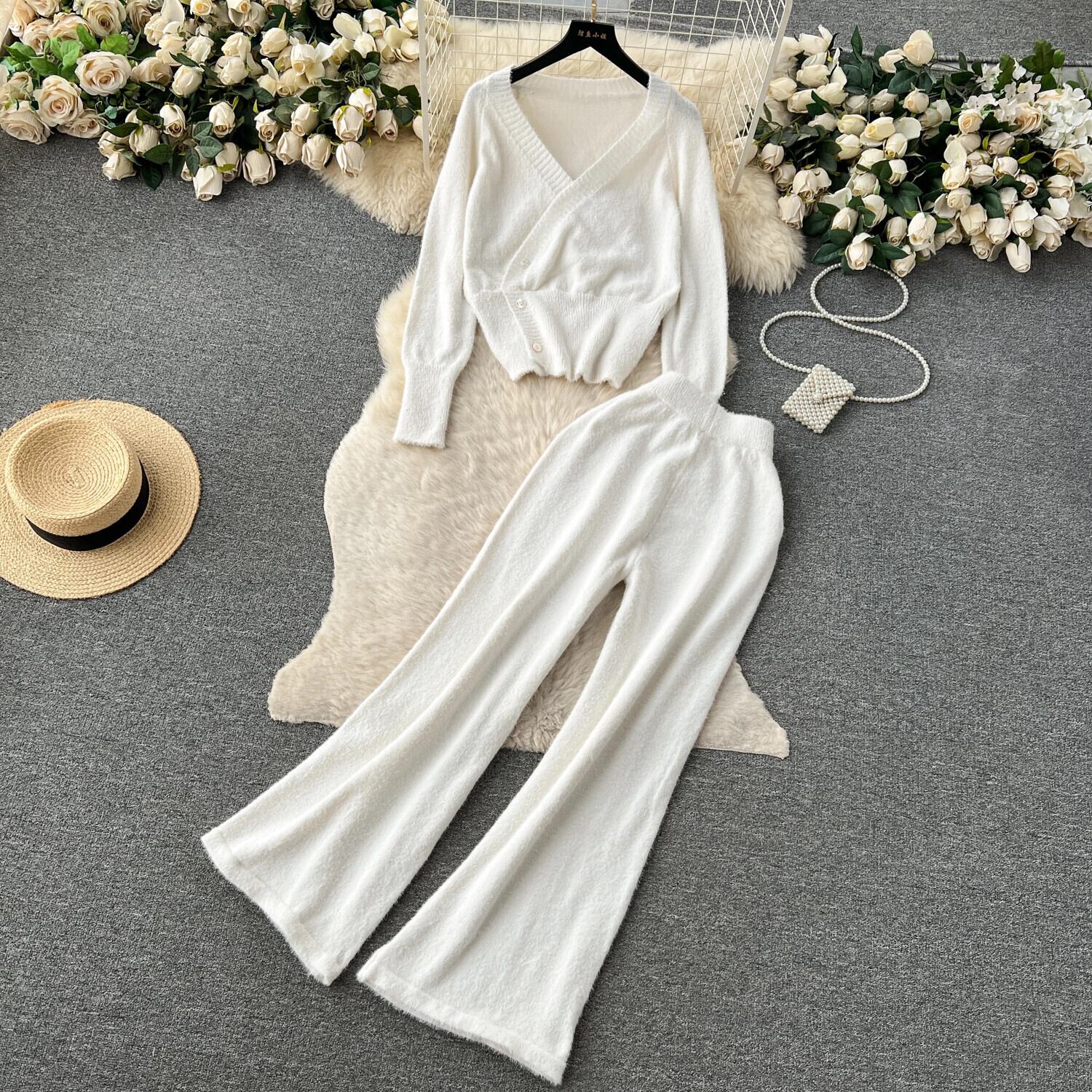 ツーピースセット不規則 V ネック長袖カーディガン弾性ウエストワイドレッグパンツ暖かいセータースーツパンツ ロング エラスティック 伸縮 Vネック ワイドパンツ