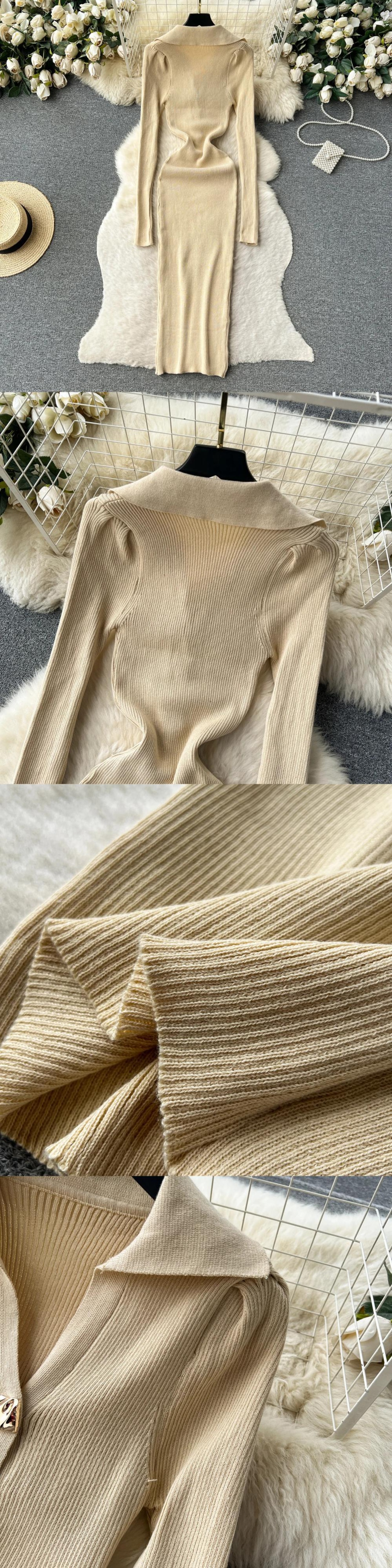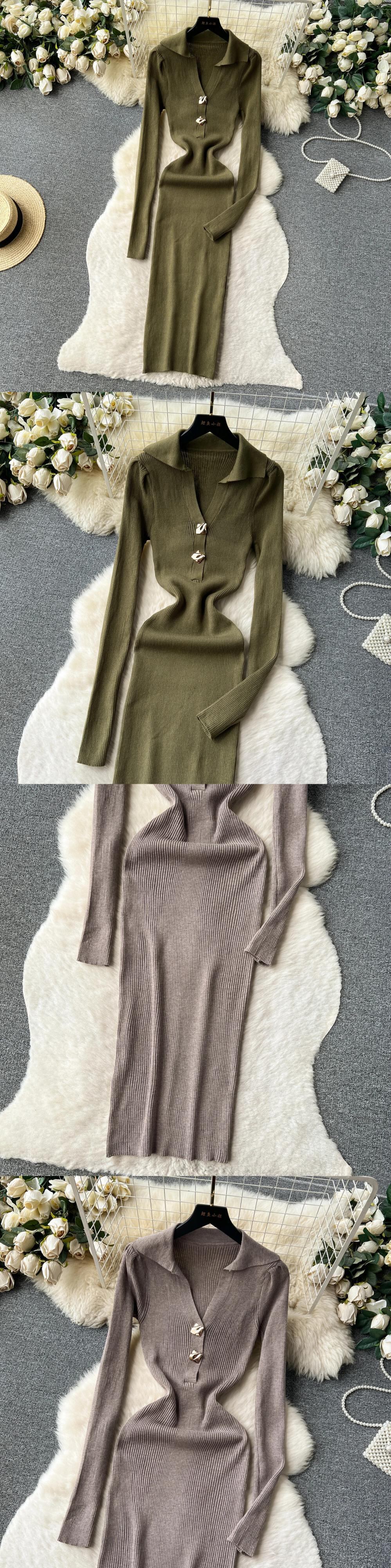 ソリッドボタンセクシーセータードレス V ネック長袖マキシロングドレス秋ストリートニットボディコンドレス オータム 秋物 Vネック ソリッドカラー
