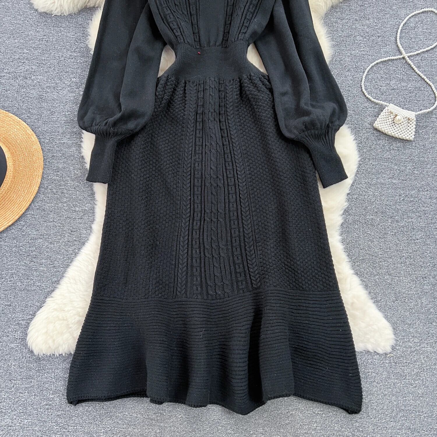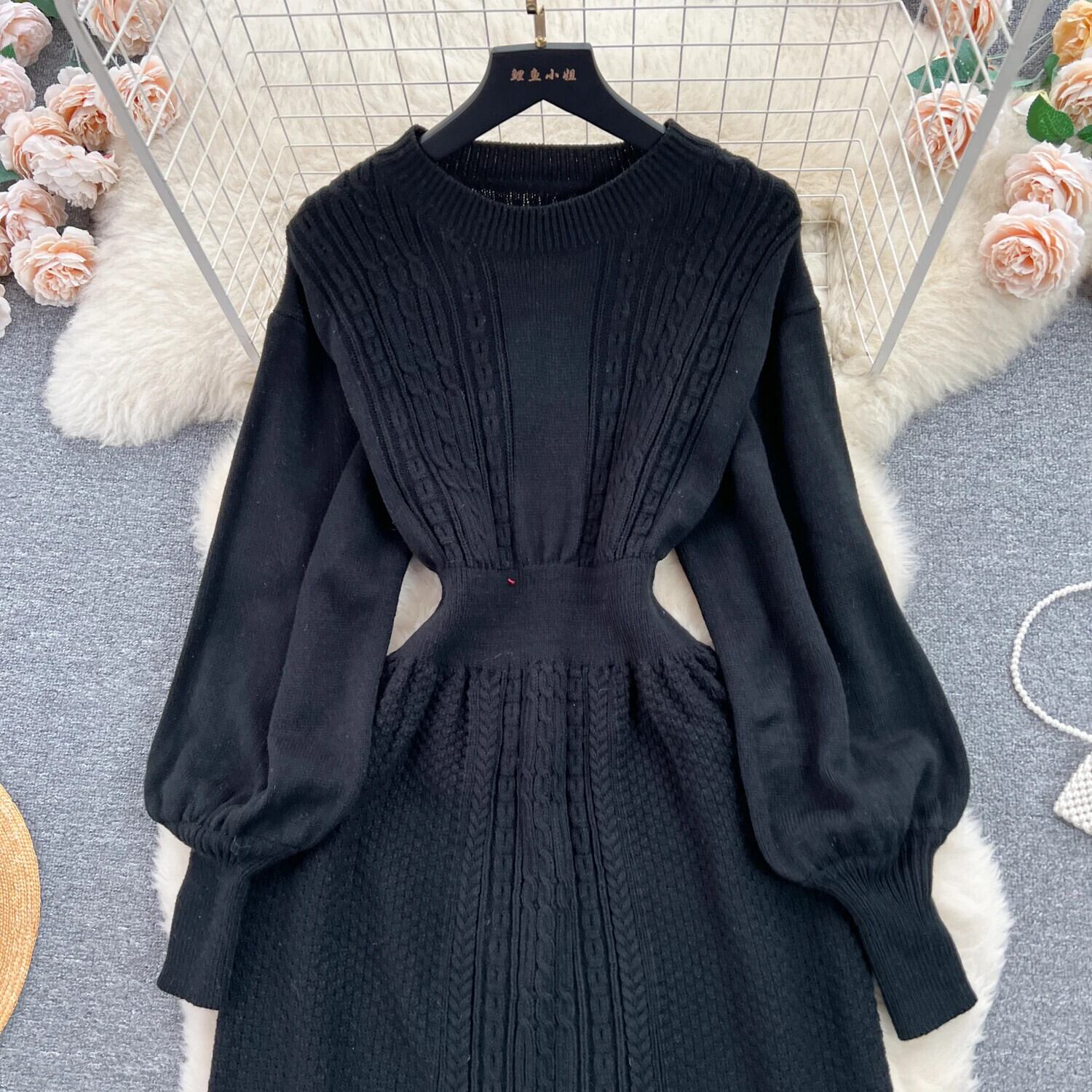 ルーズニットロングドレス弾性ウエストランタンスリーブ O ネック冬セータードレス エラスティック 伸縮 ウィンター 冬物 Oネック ソリッドカラー