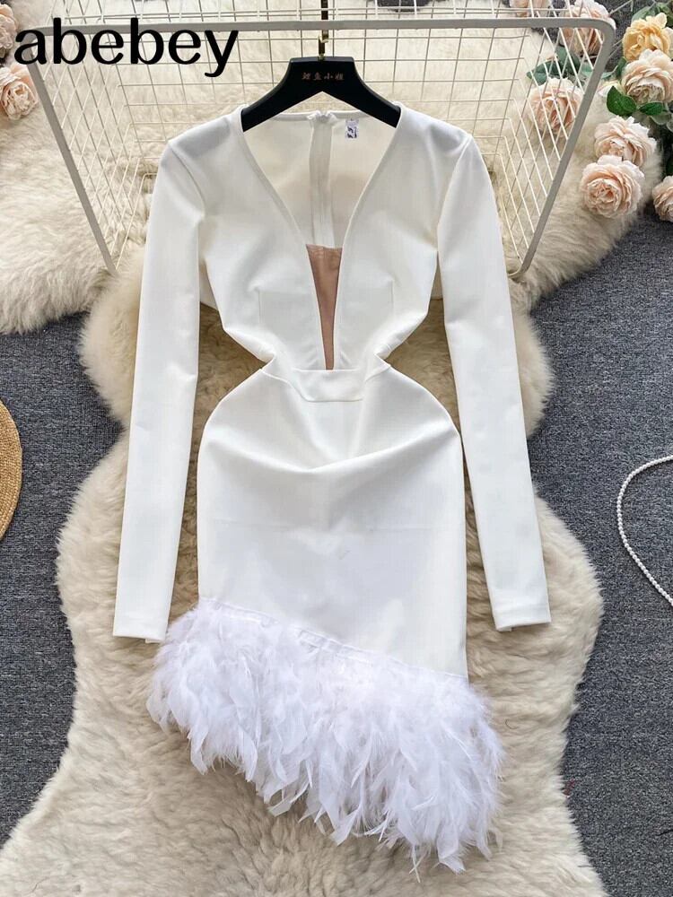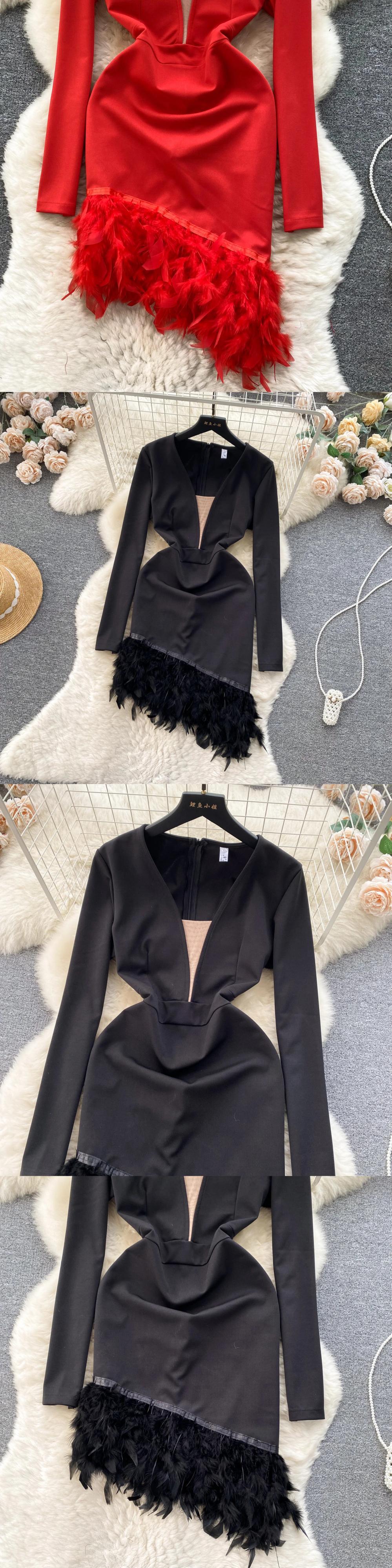 フェザースプライシング裾不規則ドレス秋 V ネック長袖ジッパーラップヒップドレス ロング オータム 秋物 Vネック