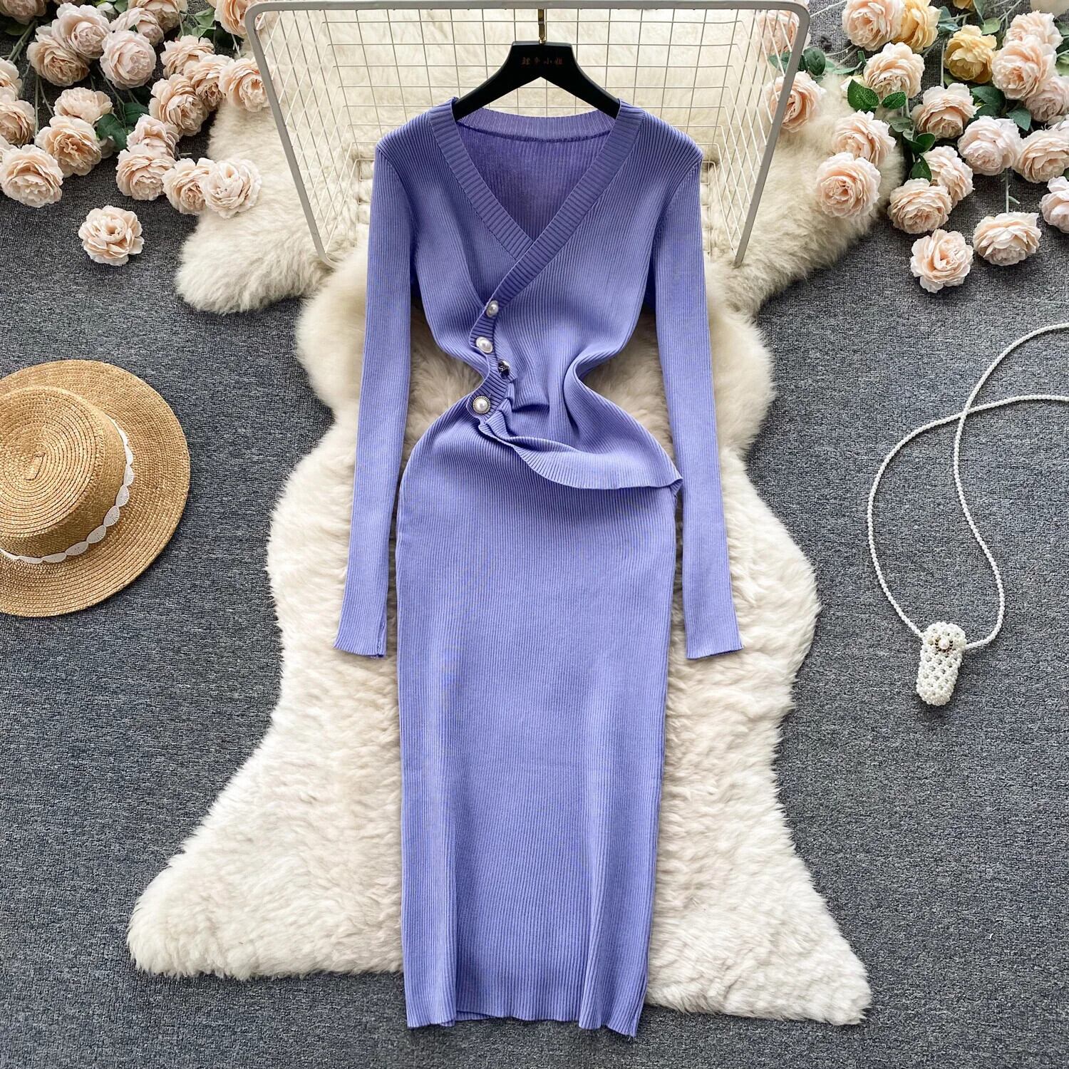 セーターソリッドドレス長袖ボタン冬厚手暖かいオフィスレディニットボディコンドレス ロング ウィンター 冬物 ソリッドカラー 会社 学校 通勤や通学にも