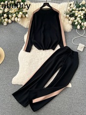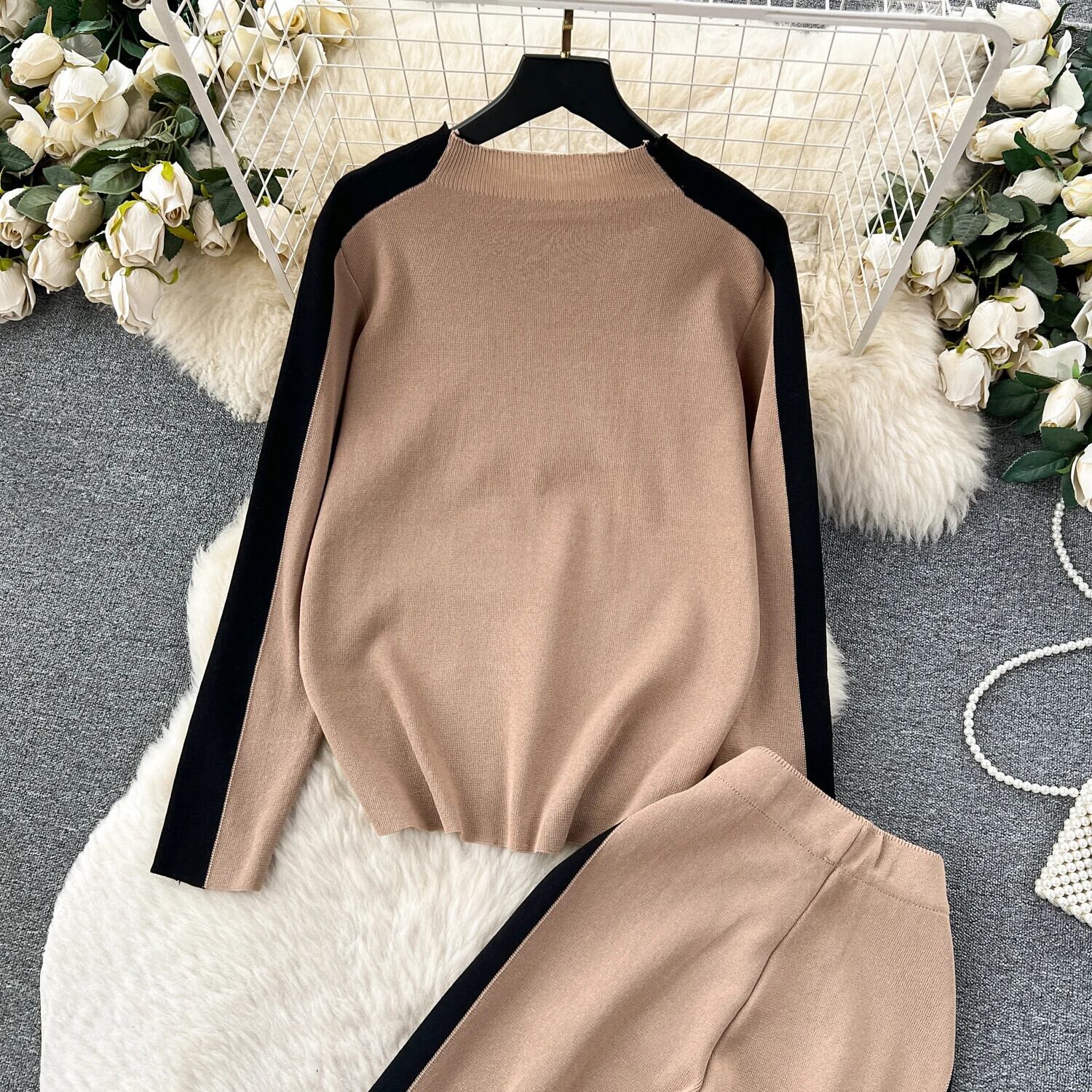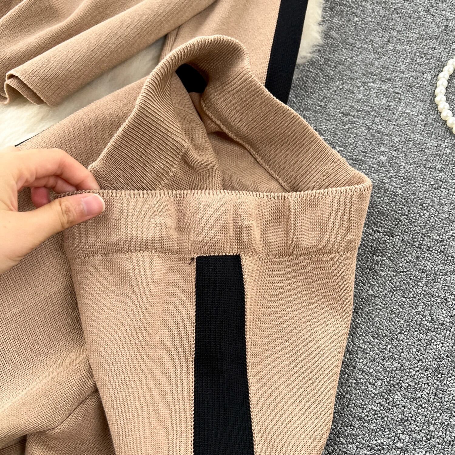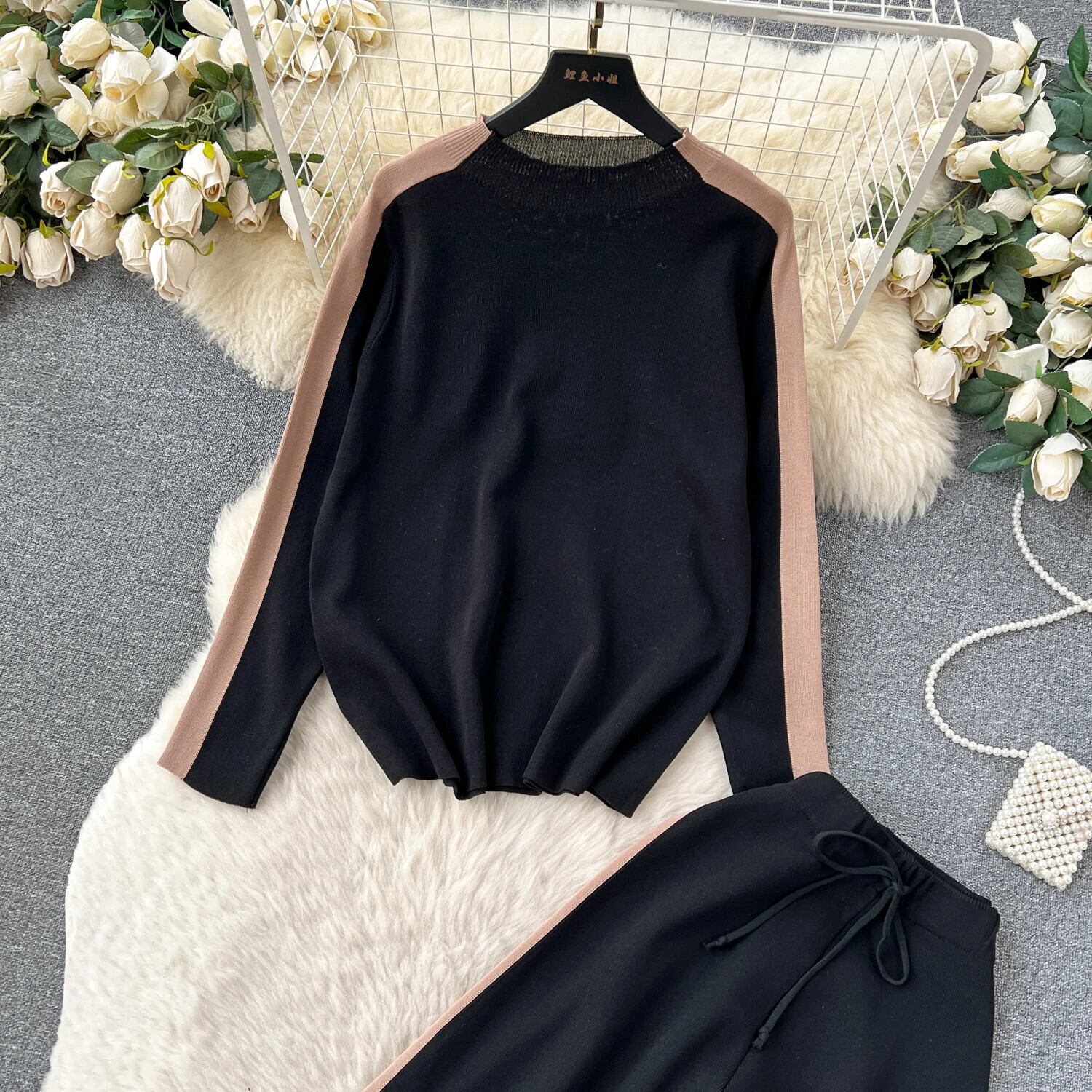 厚手セーター 2 ピース スーツ ルーズ暖かいトップ + ワイドレッグ ロング パンツ フレンチ ニット セット ワイドパンツ ソリッドカラー