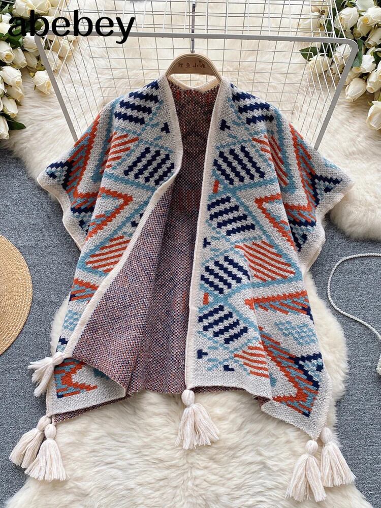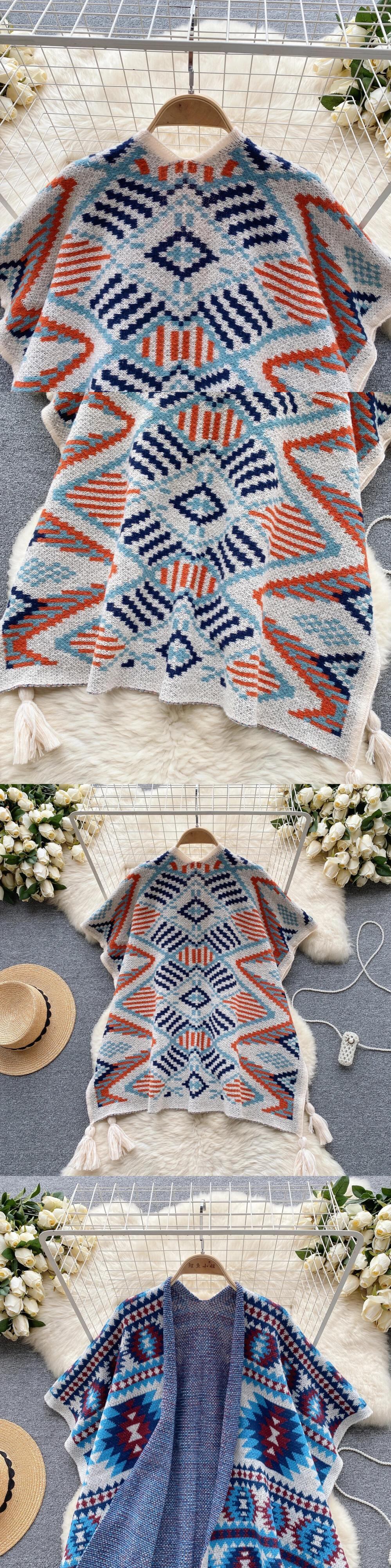 ポンチョニットマントニットケープエスニックスタイルケープテルカーディガンセーターカラールースストライプ旅行コート