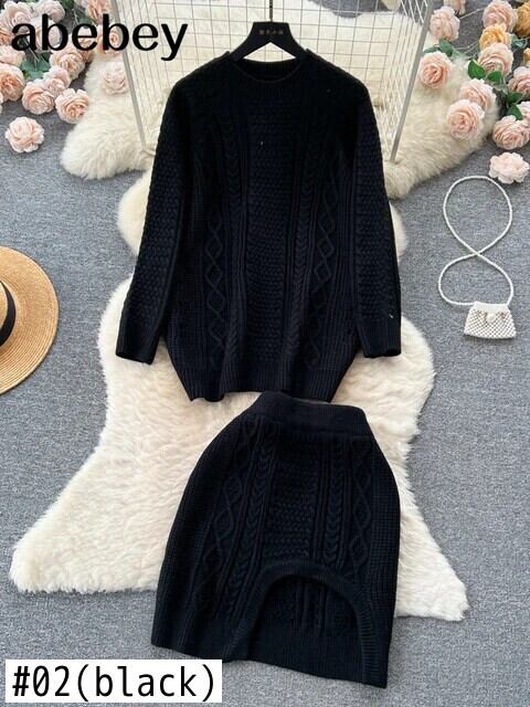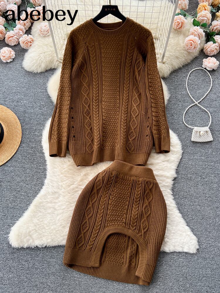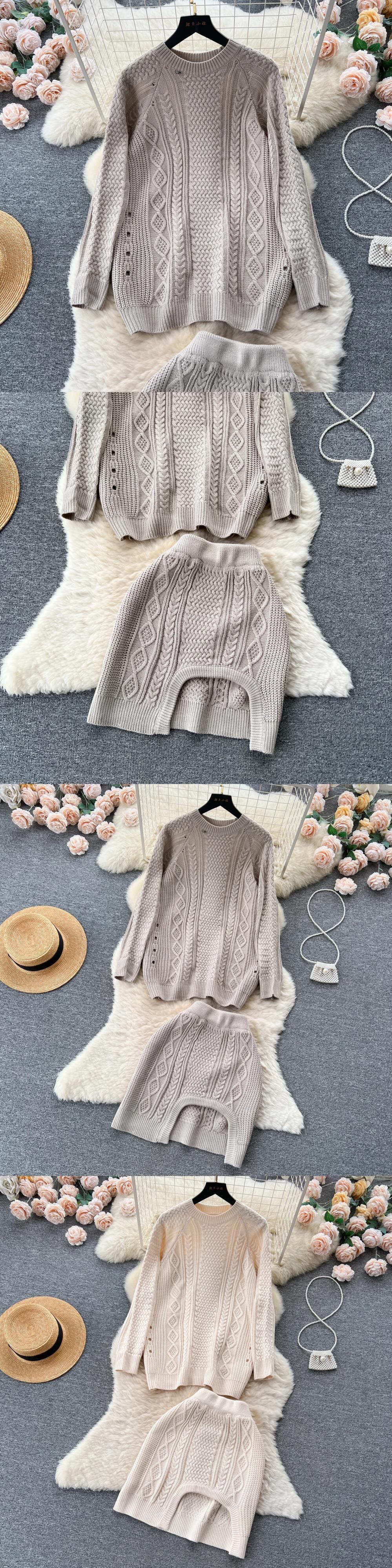 厚手セータースーツ O ネック長袖ルーズプルオーバー + ミニニットスカート暖かいニット 2 枚セット ロング Oネック