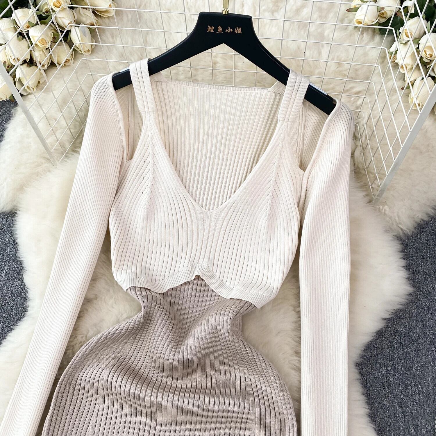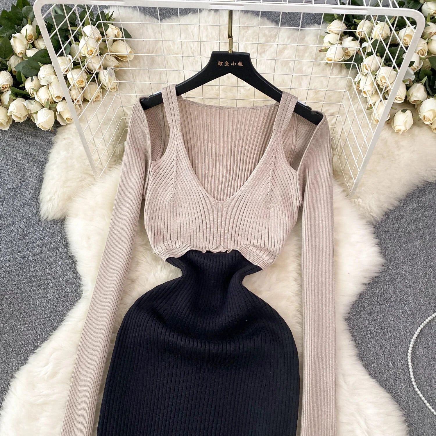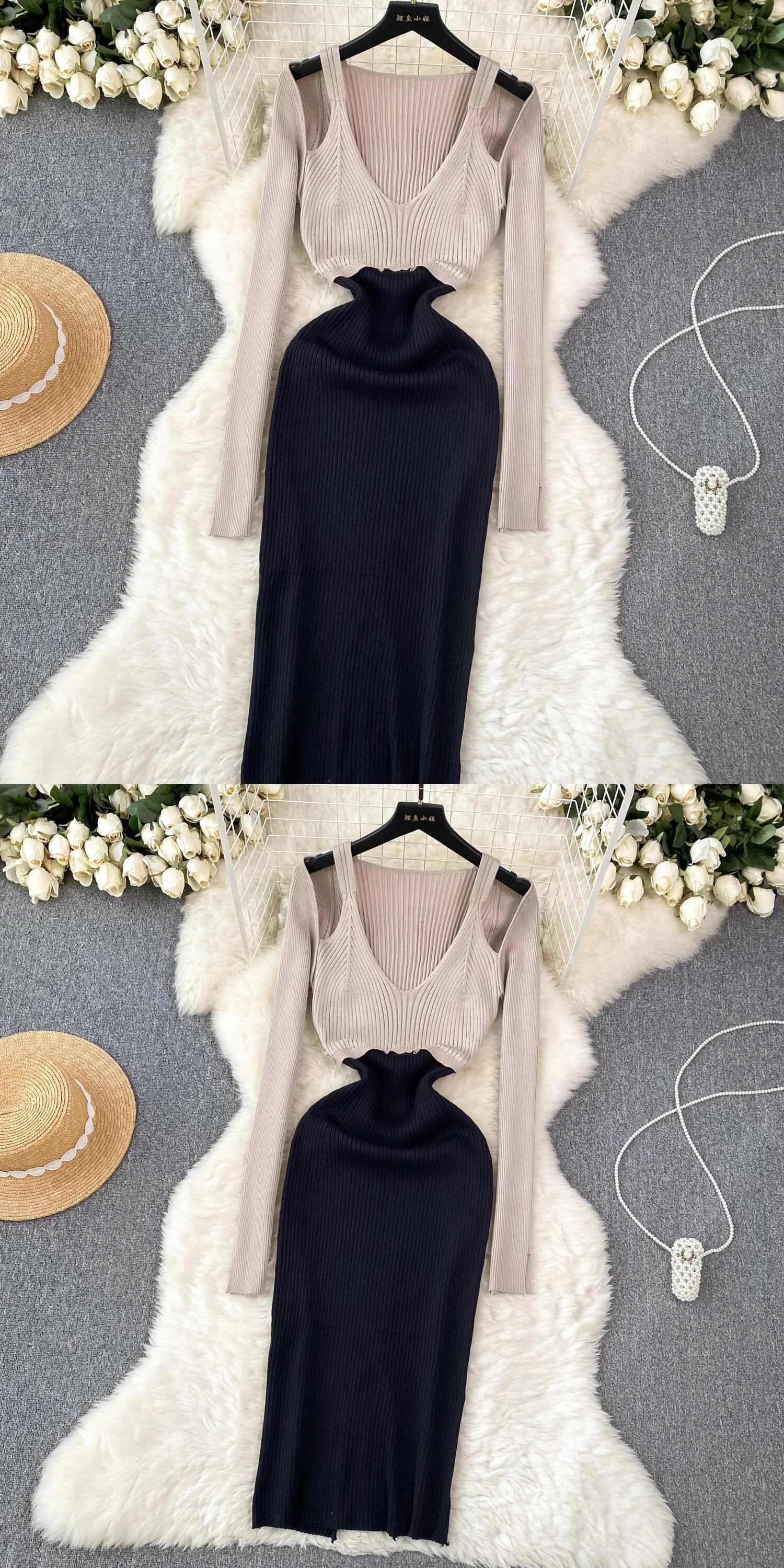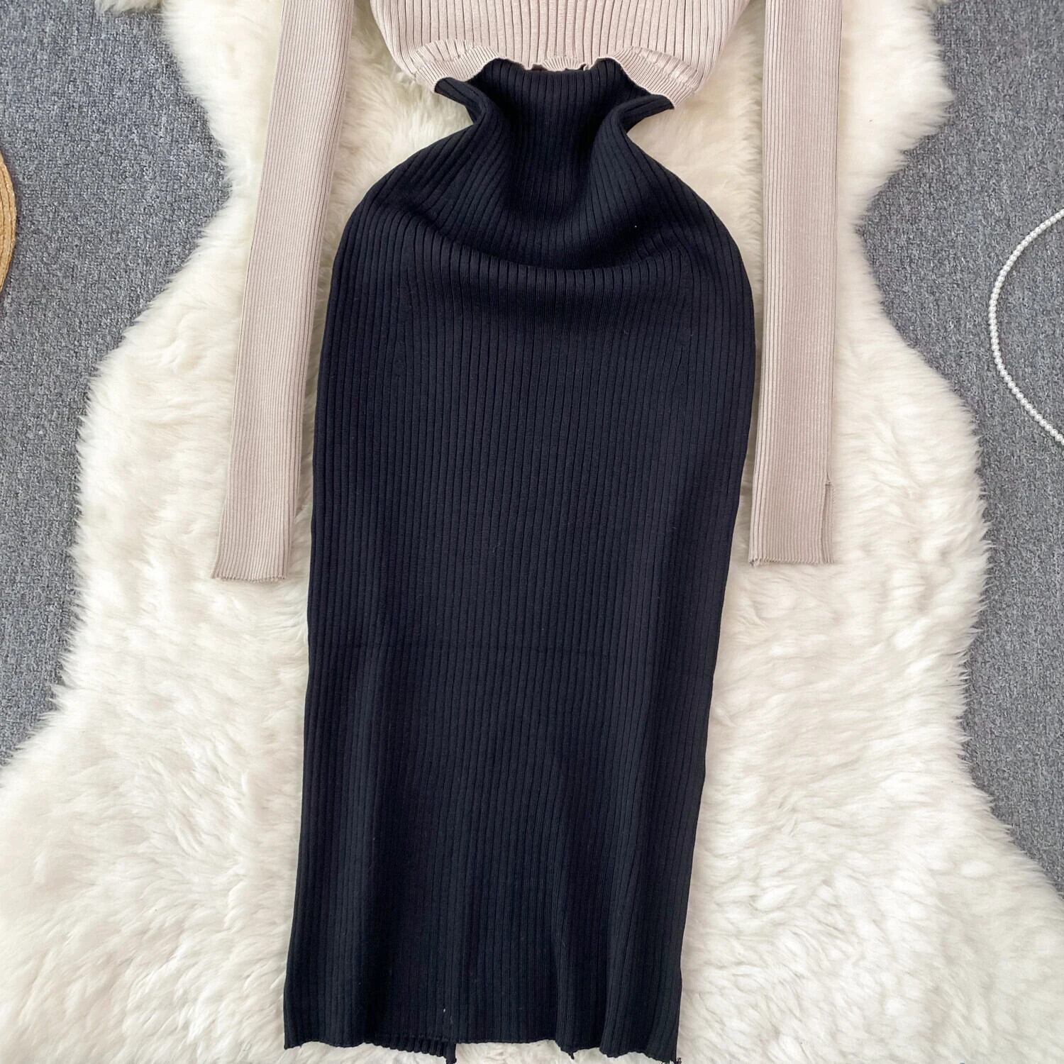 秋ニットロングドレスフルスリーブアウト不規則セクシーオフィスレディ暖かいスプリットドレス オータム 秋物 会社 学校 通勤や通学にも