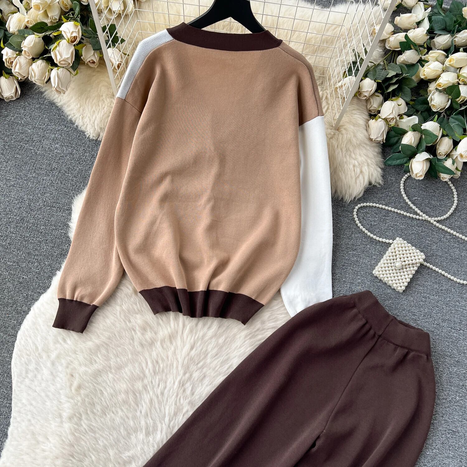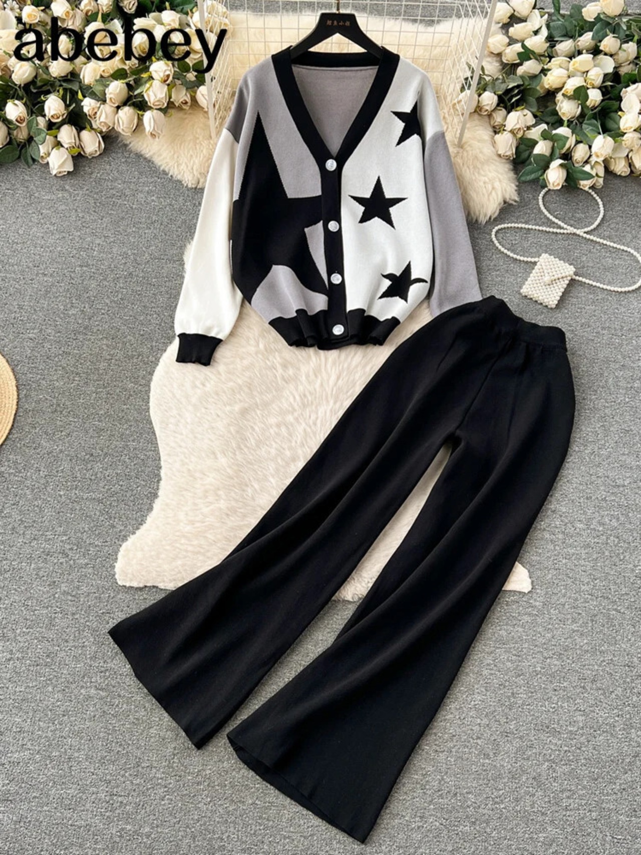 冬ニットセットルーズウォームプリントカーディガン+弾性ワイドレッグロングパンツストリートツーピーススーツ エラスティック 伸縮 ウィンター 冬物 ワイドパンツ
