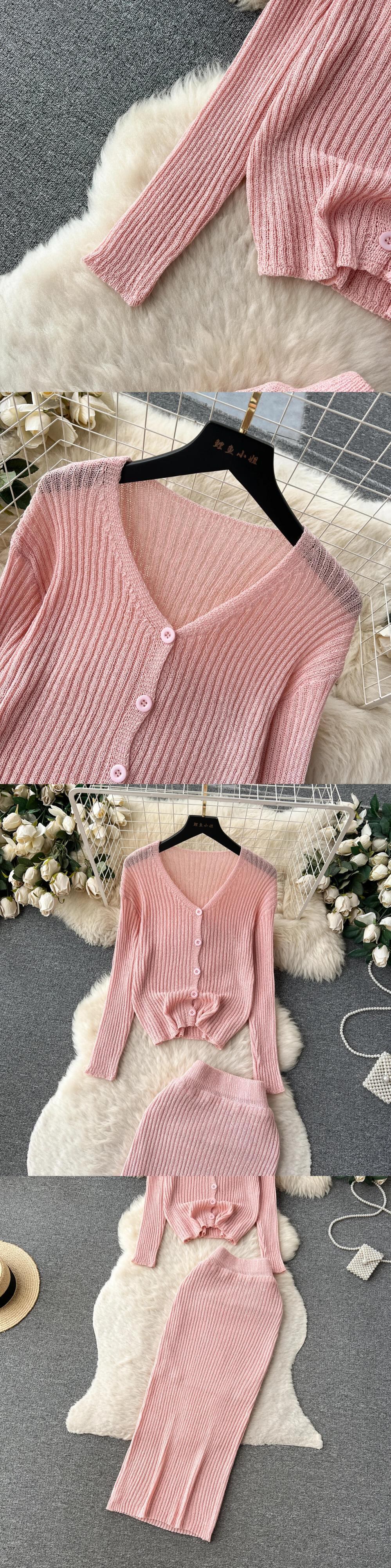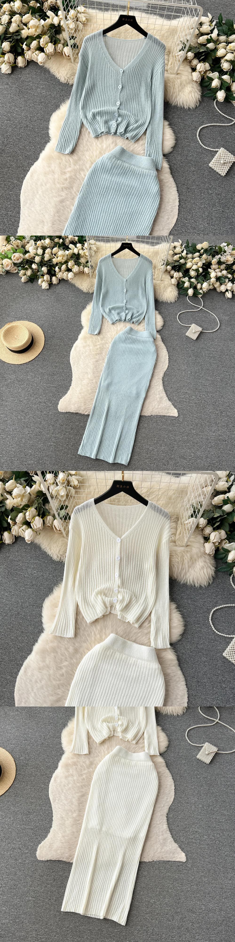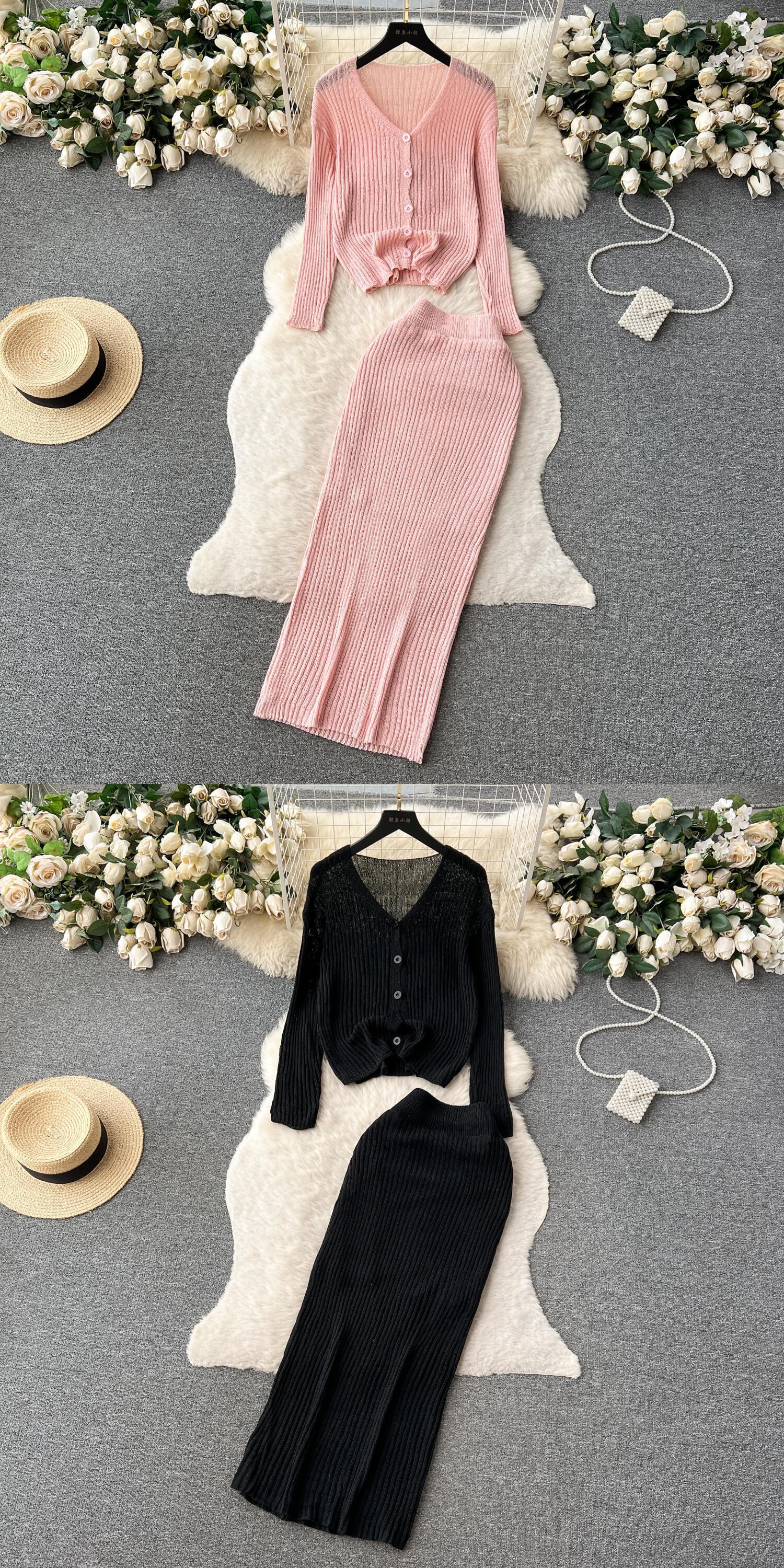 フランスニットスーツ V ネックシングルブレスト長袖ブラウス + ウエストボディコンスカート秋ストライプセット ロング オータム 秋物 Vネック