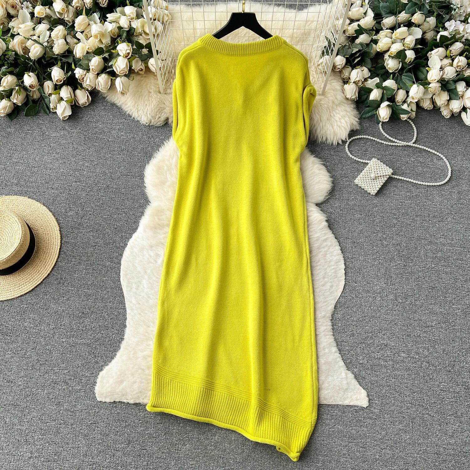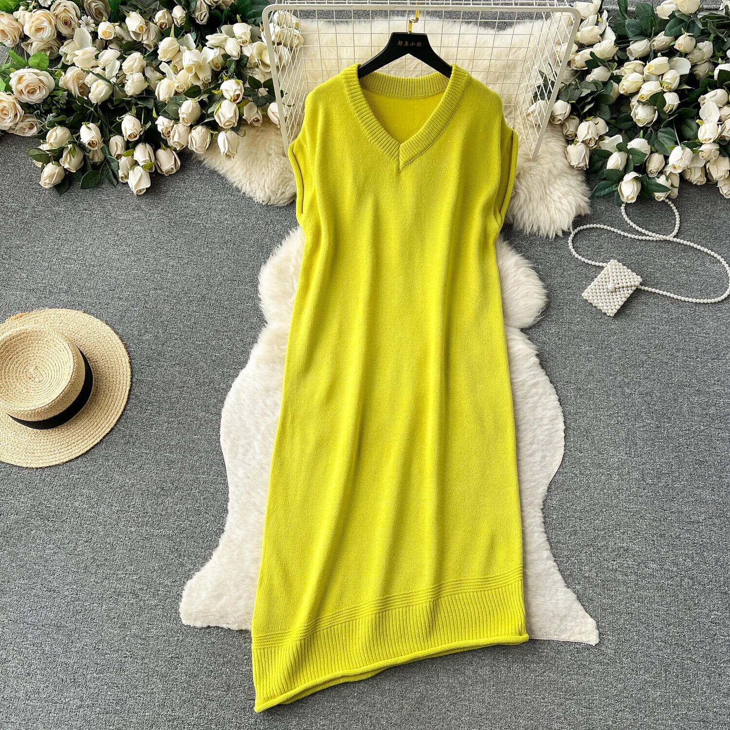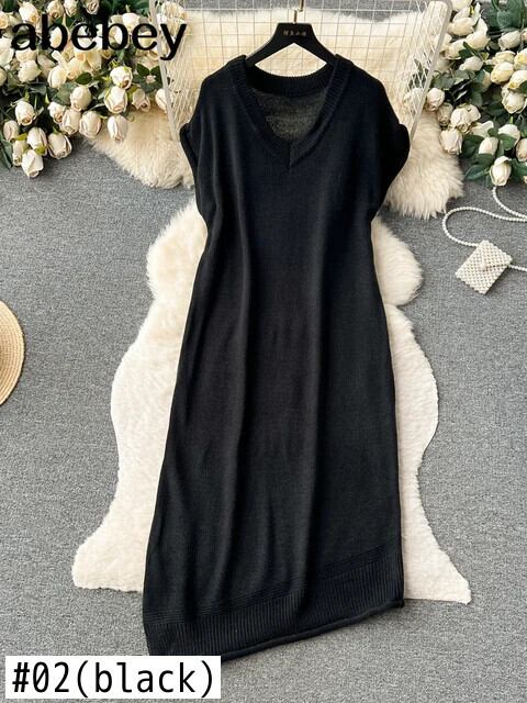 ノースリーブニットタンクドレスソリッド V ネック不規則ストリートベーシックプレッピースタイルセーター A ラインドレス Vネック Aライン ソリッドカラー