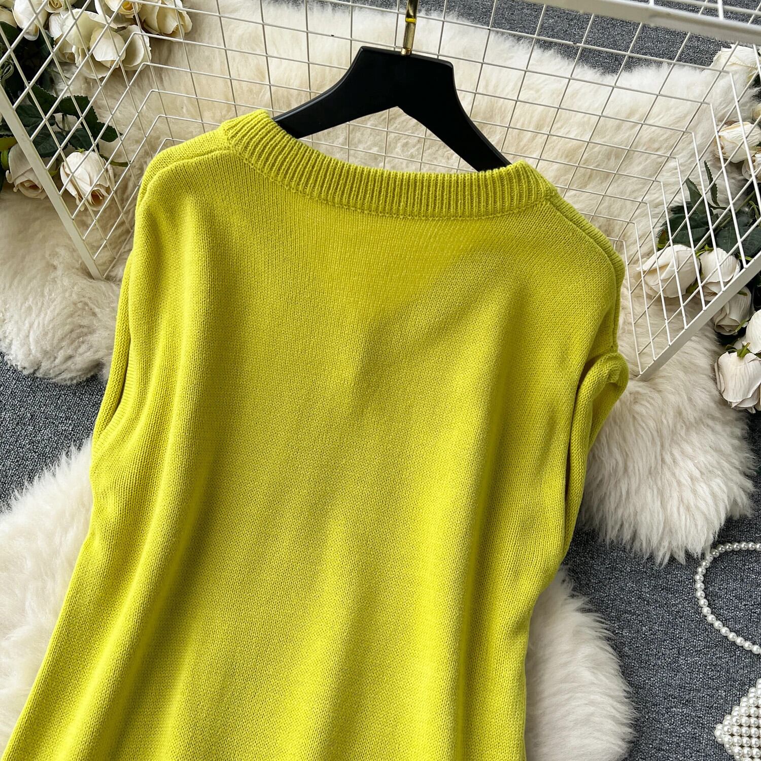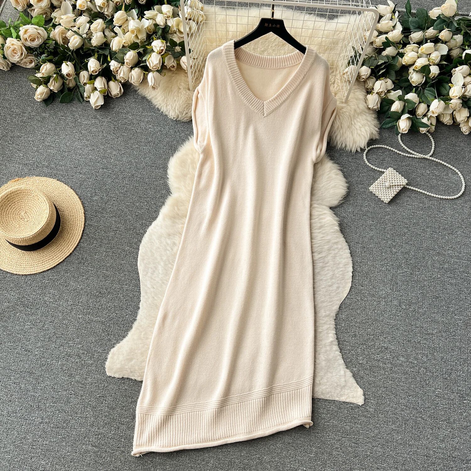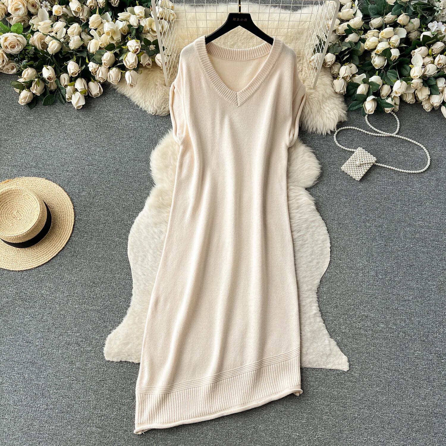 ノースリーブニットタンクドレスソリッド V ネック不規則ストリートベーシックプレッピースタイルセーター A ラインドレス Vネック Aライン ソリッドカラー