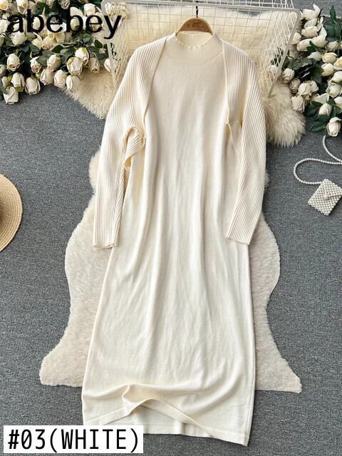 ニットドレススーツルーズロングカーディガンクロップトップ + ストラップ厚いロングドレスストリート暖かいセーターセット ソリッドカラー