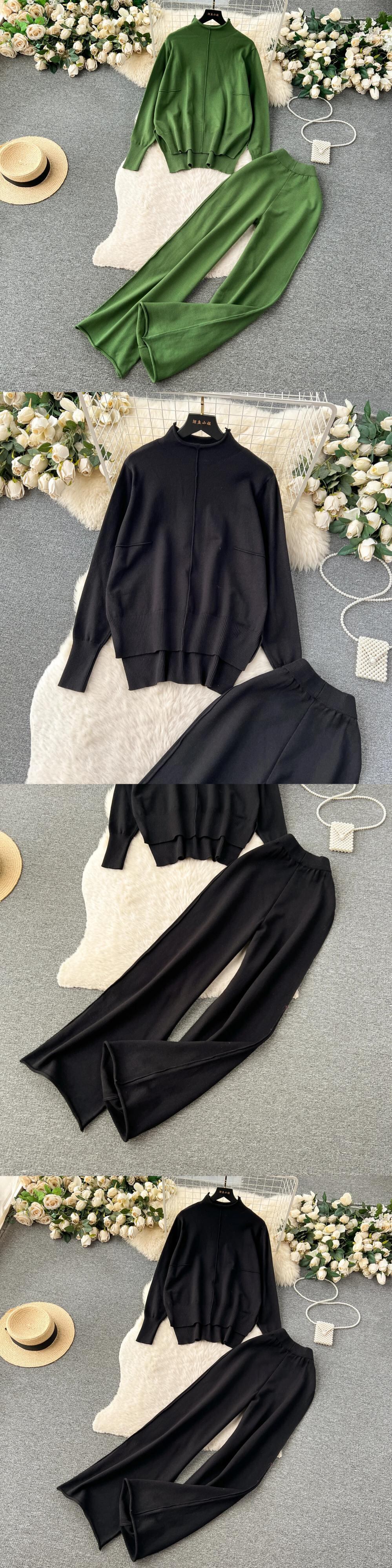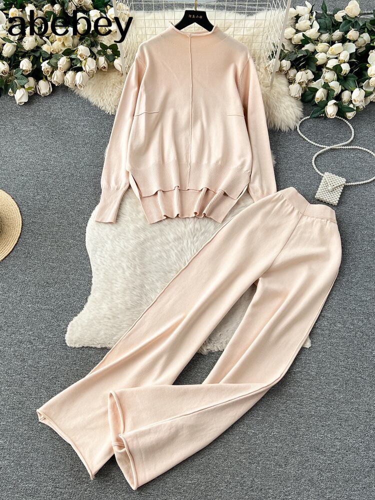 2 個セットニットトラックスーツ O ネックセーターとストレートパンツプルオーバーセーターセット日常着 Oネック ソリッドカラー