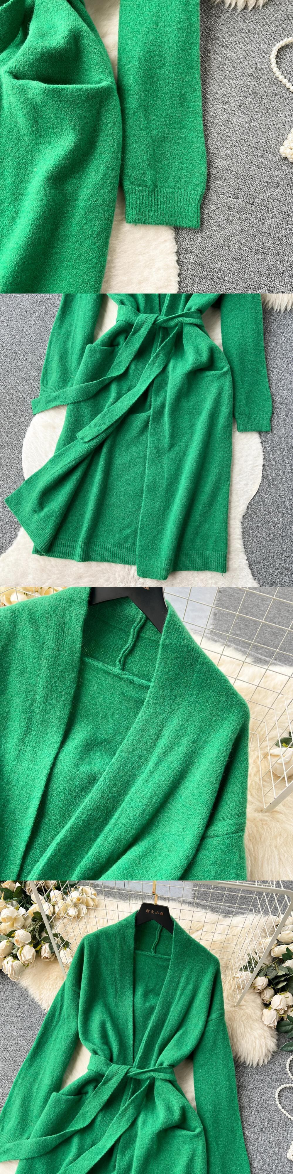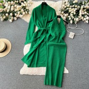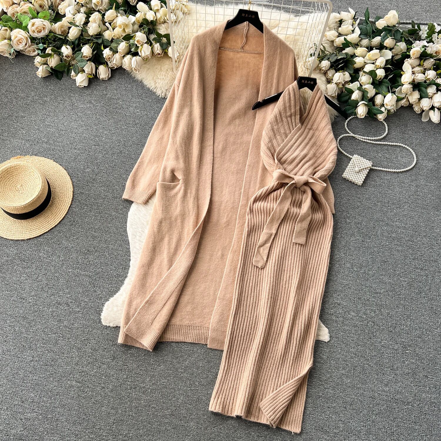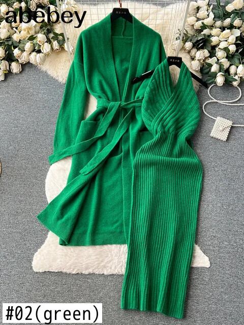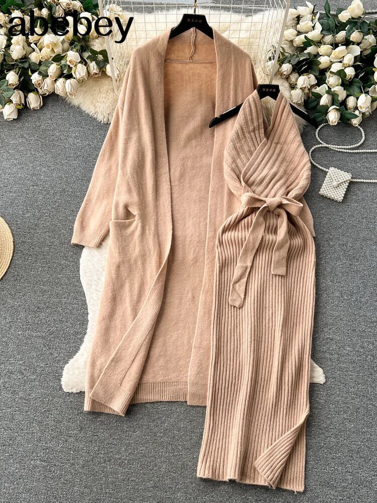 ニットツーピーススーツベルトルーズロングカーディガン + ストライプホルタースリムボディコンドレス優しく暖かいセーターセット ハーネス ソリッドカラー