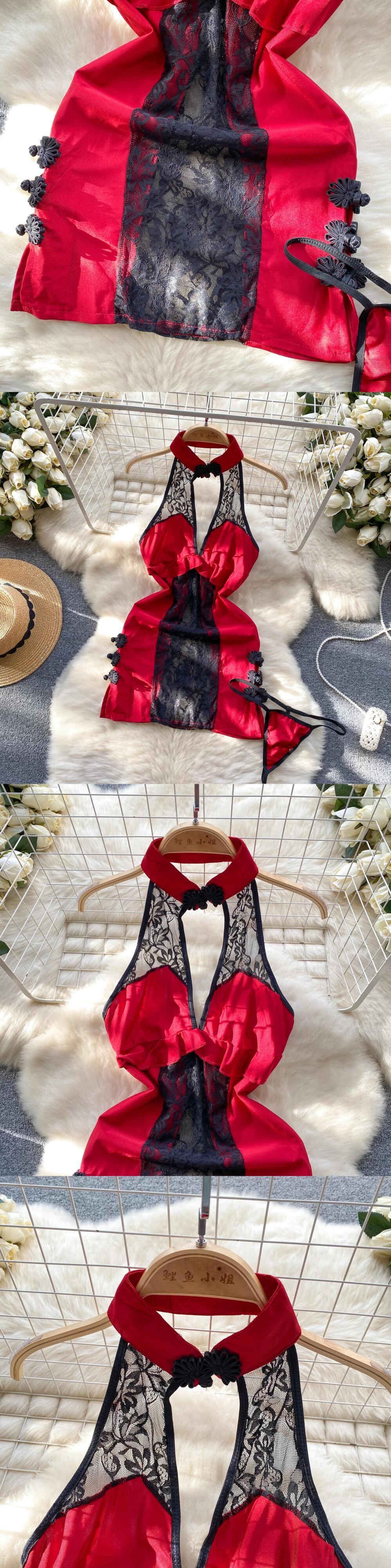 中国風セクシー薄手ナイトドレスホルターチャイナレース背中開いたドレス + Tバックスプリットエロポルノナイト