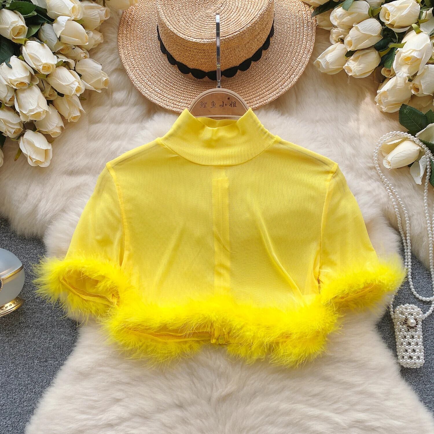 コンサイス フェザー ソリッド タートルネック 半袖 シースルー セクシー スキニー クロップトップ シャツ 秋 ストリート パーティー Y2K ショート ハーフスリーブ ソリッドカラー