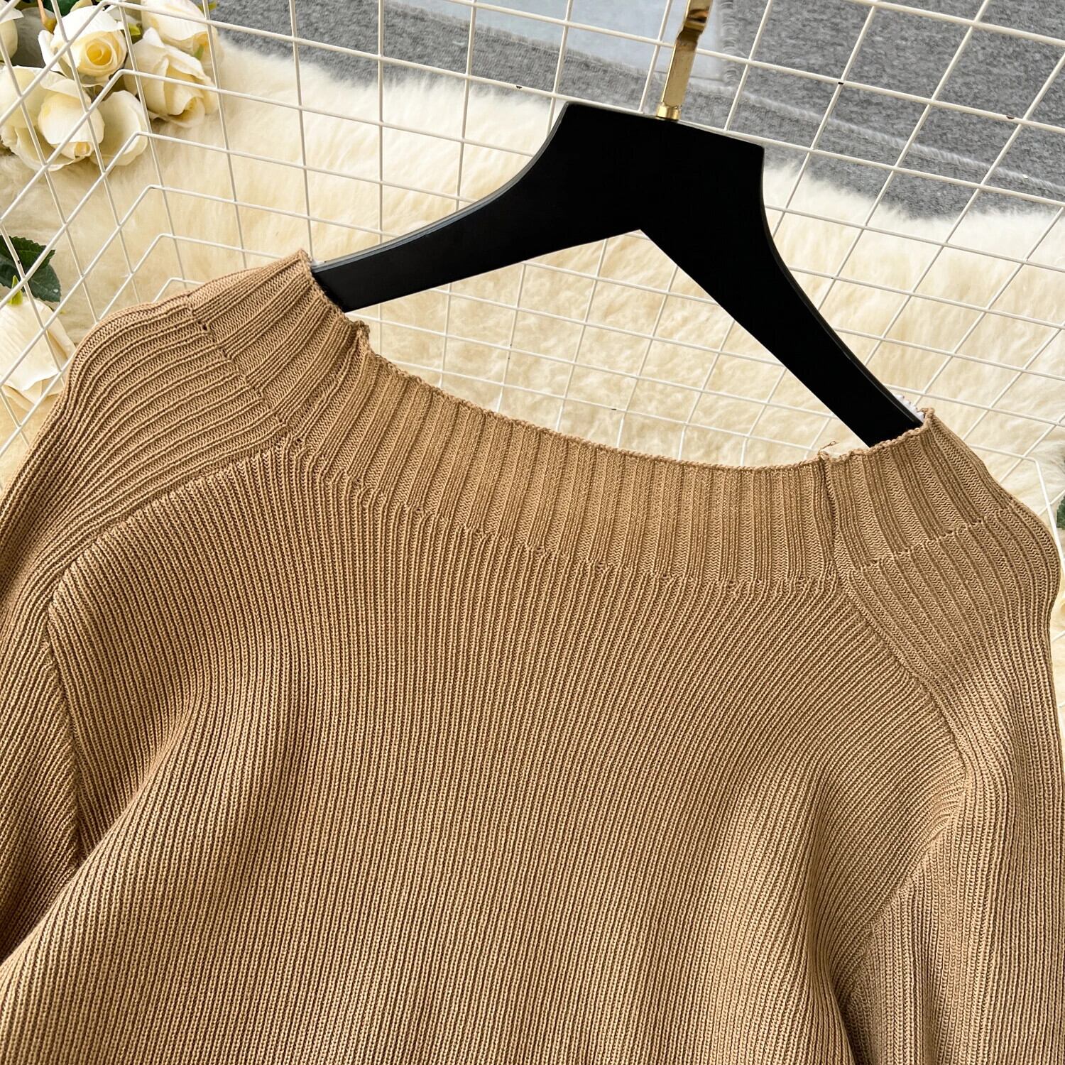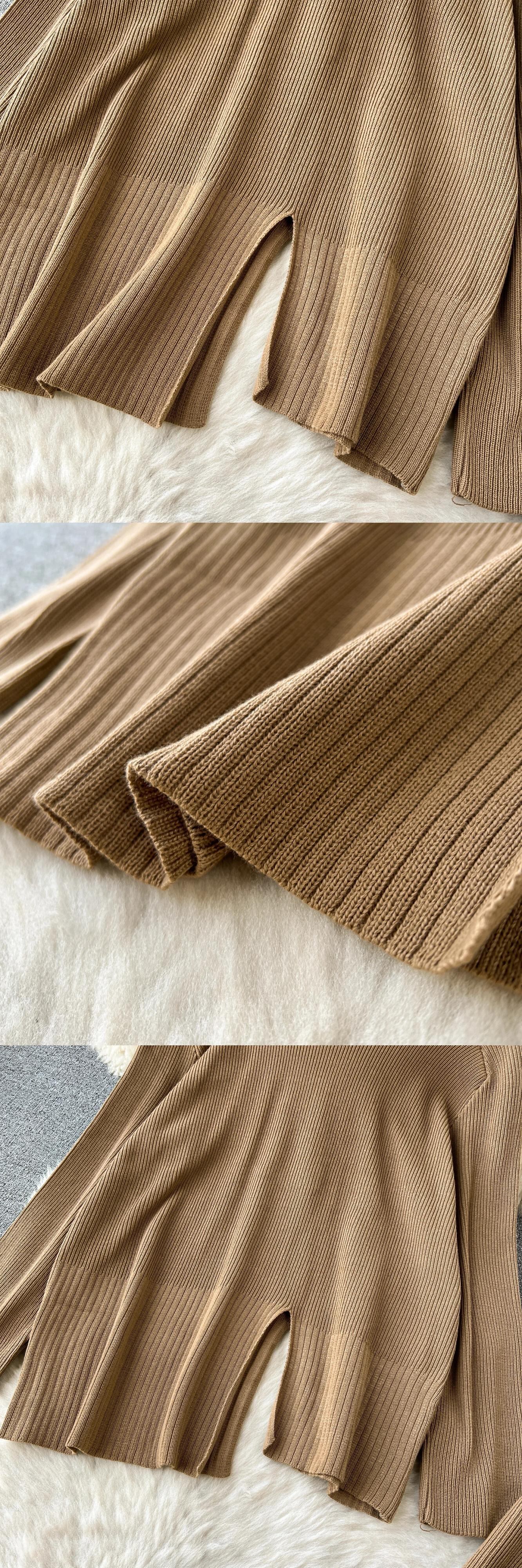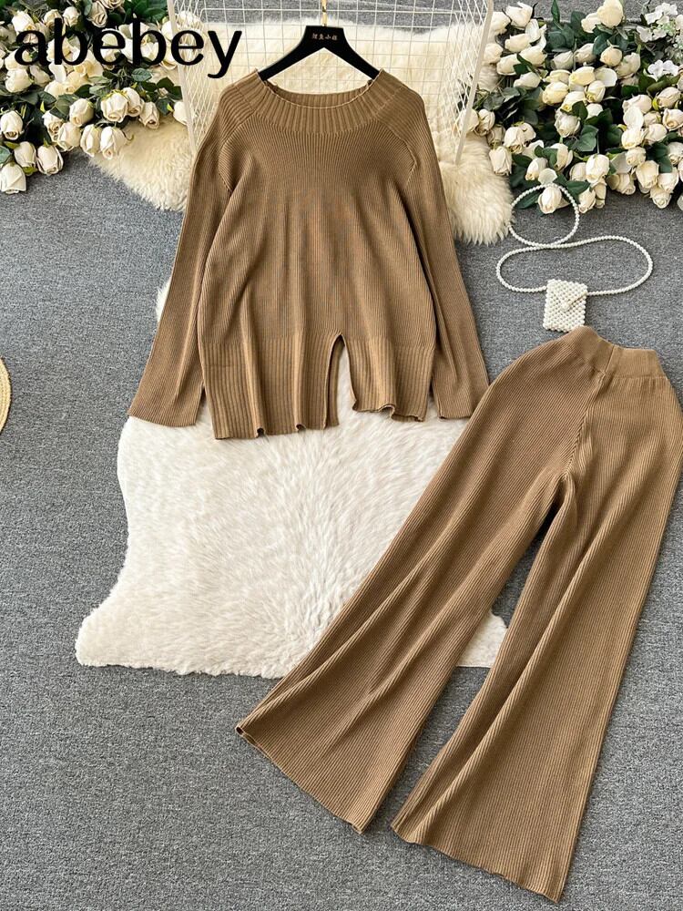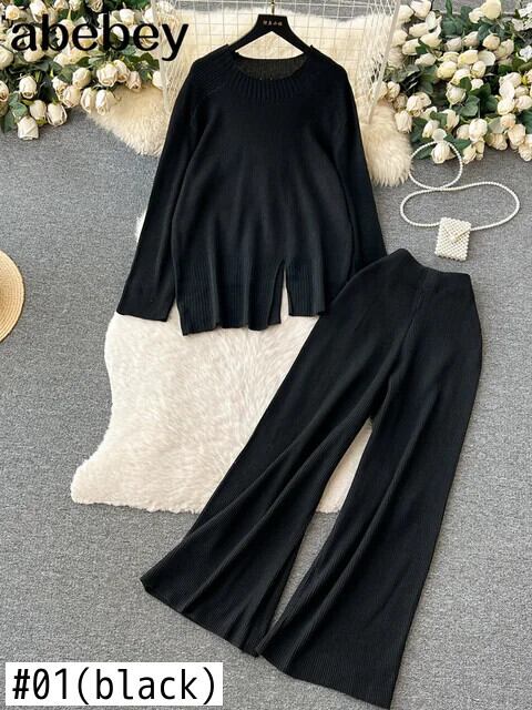 秋ニットセットフルスリーブルーズスプリットプルオーバー + ワイドレッグロングパンツホームセータースーツ オータム 秋物 ワイドパンツ