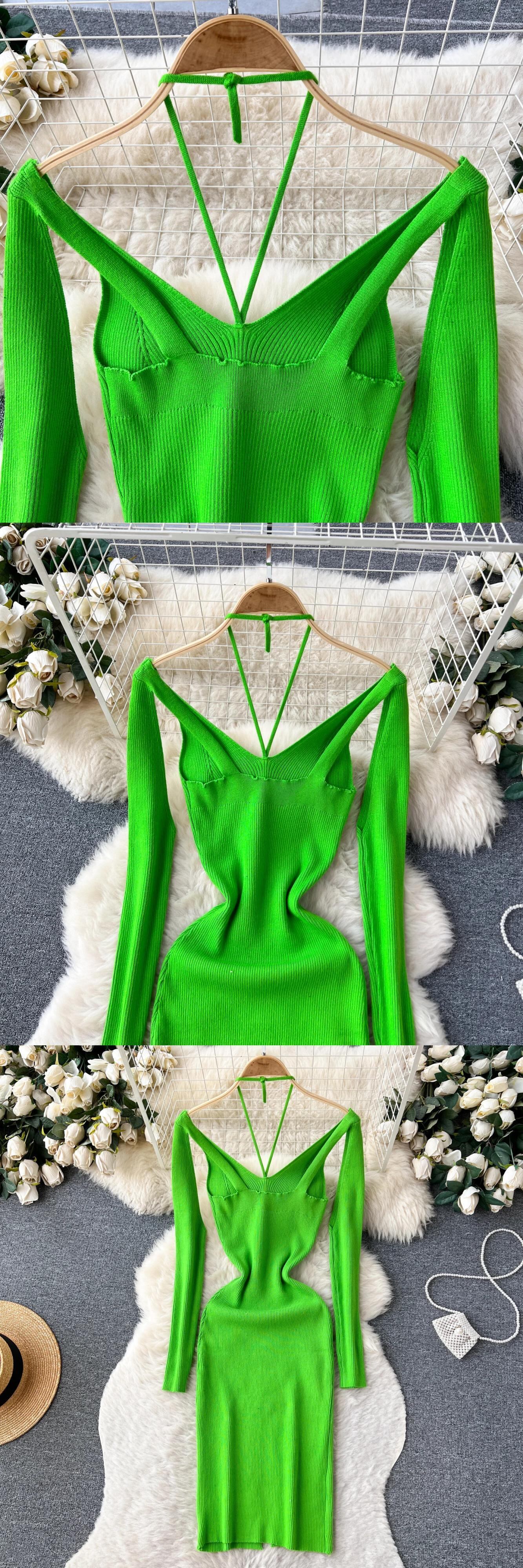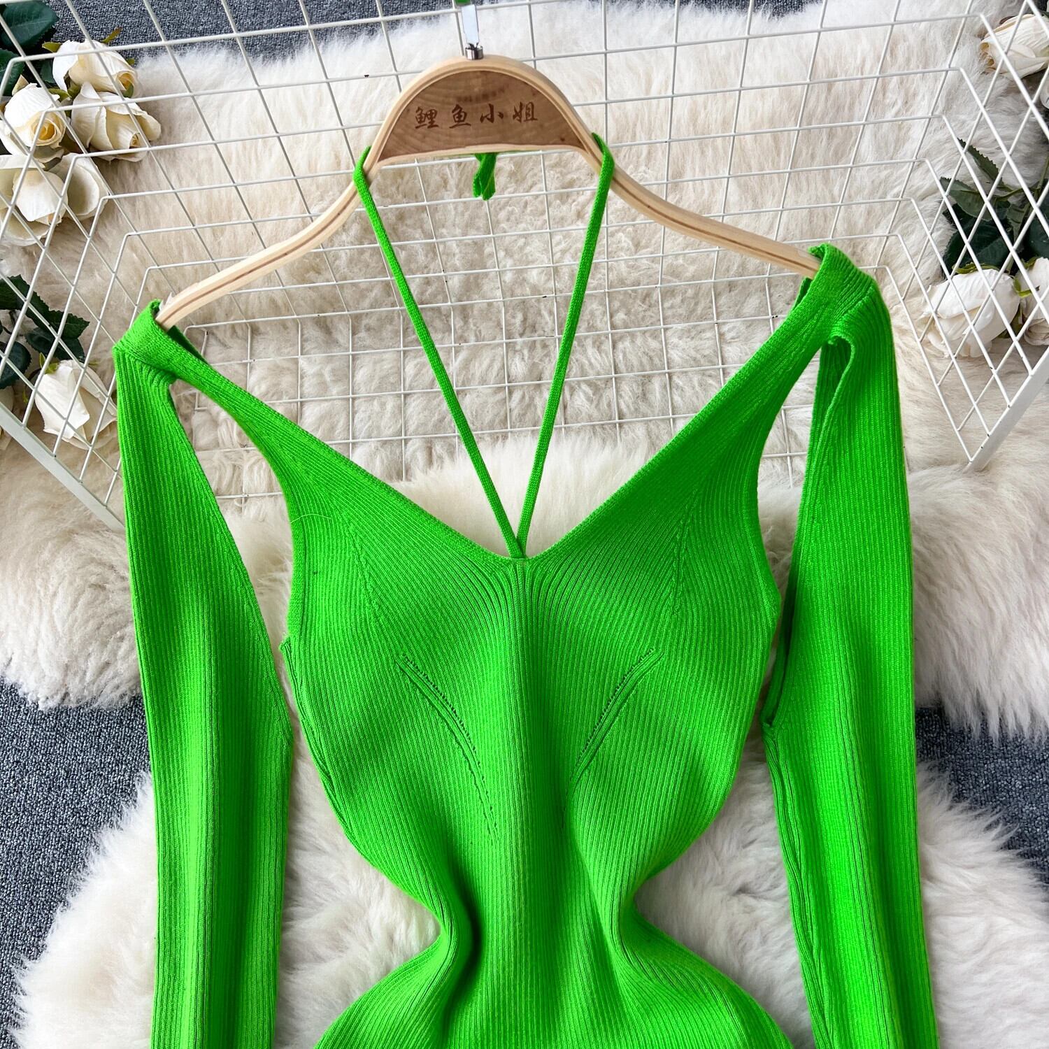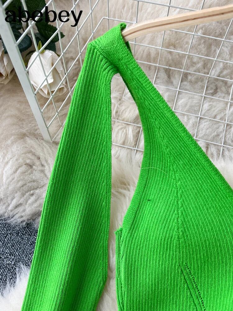 ディープ V ネックセクシーセータードレス長袖ミディロングドレス秋ストリートニットボディコンドレス オータム 秋物 Vネック ソリッドカラー