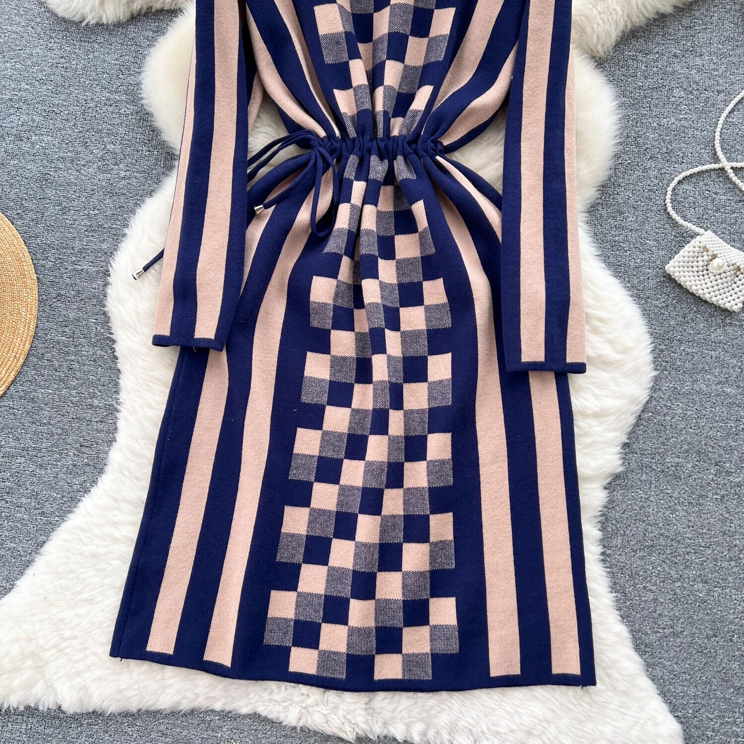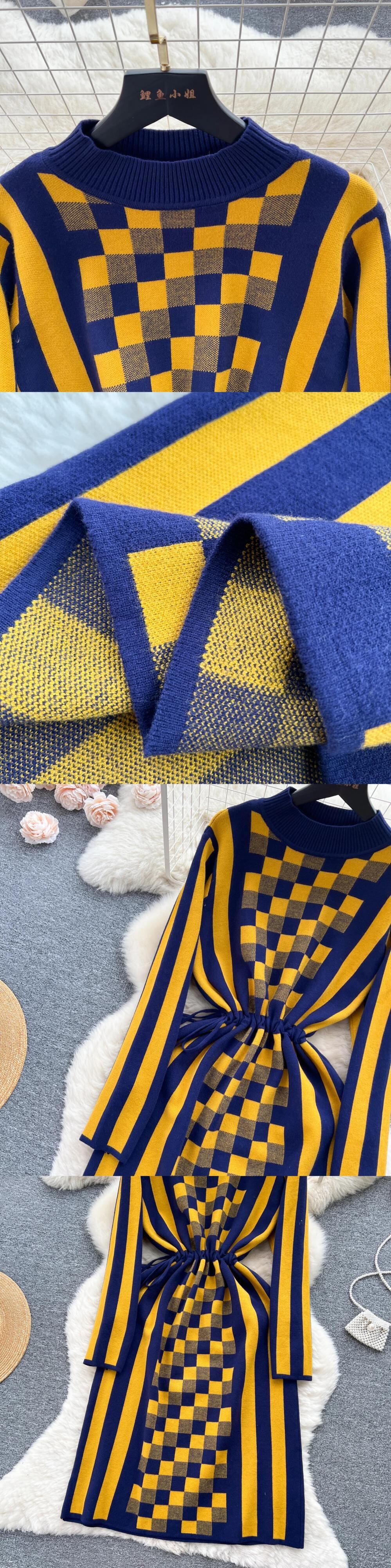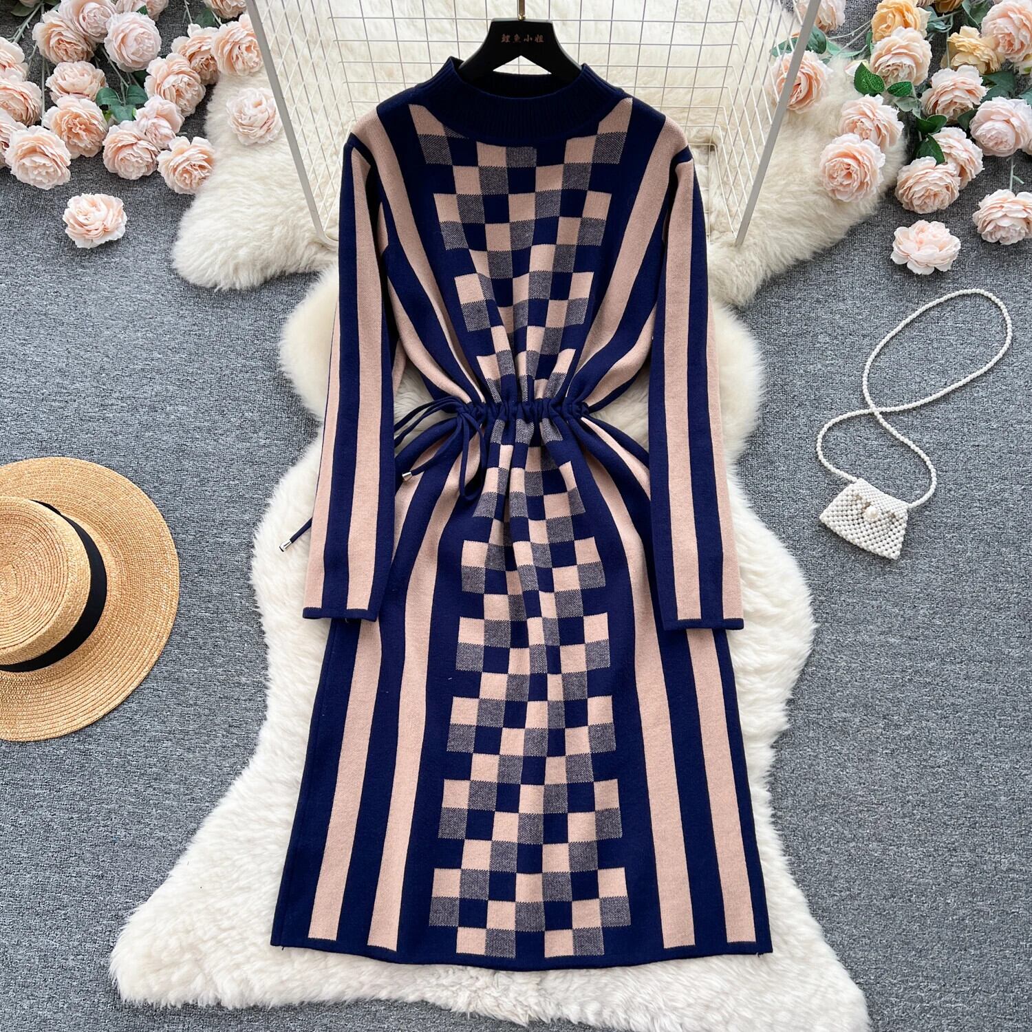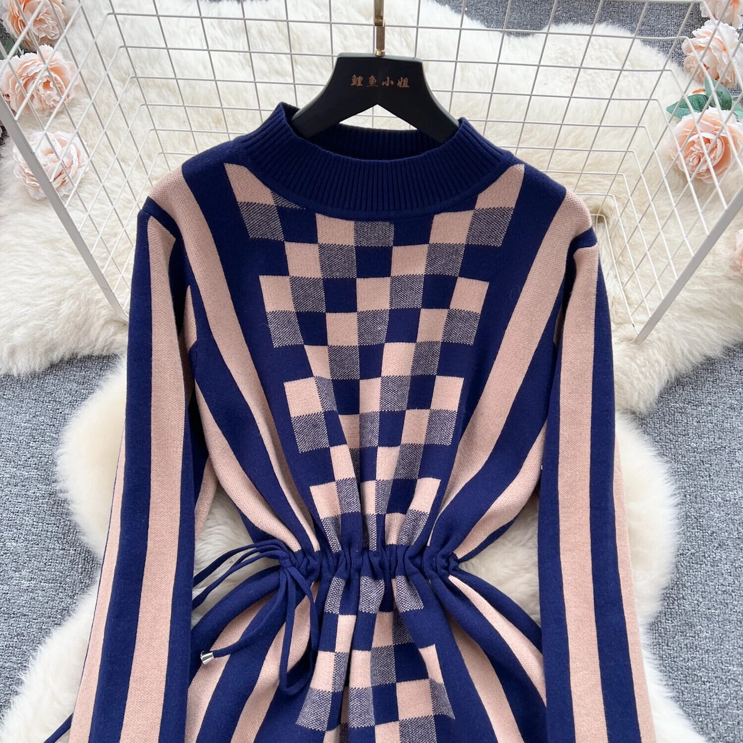 チェック柄ストライプレトロドレス O ネック長袖巾着ウエストシニア冬セーター厚い A ラインドレス ロング ウィンター 冬物 Oネック Aライン