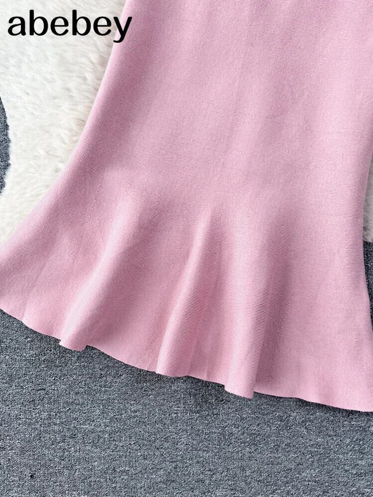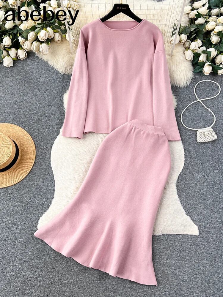 冬セーターセットロングフレアスリーブ O ネックプルオーバー + ウエストゴムルーズ A ラインスカートシンプルスタイルベーシックスーツ エラスティック 伸縮 ウィンター 冬物 Oネック Aライン
