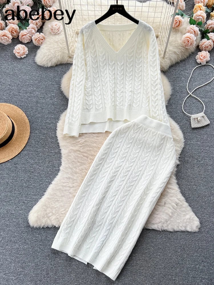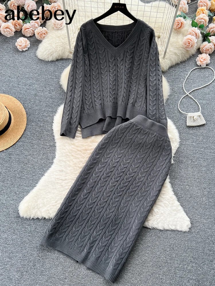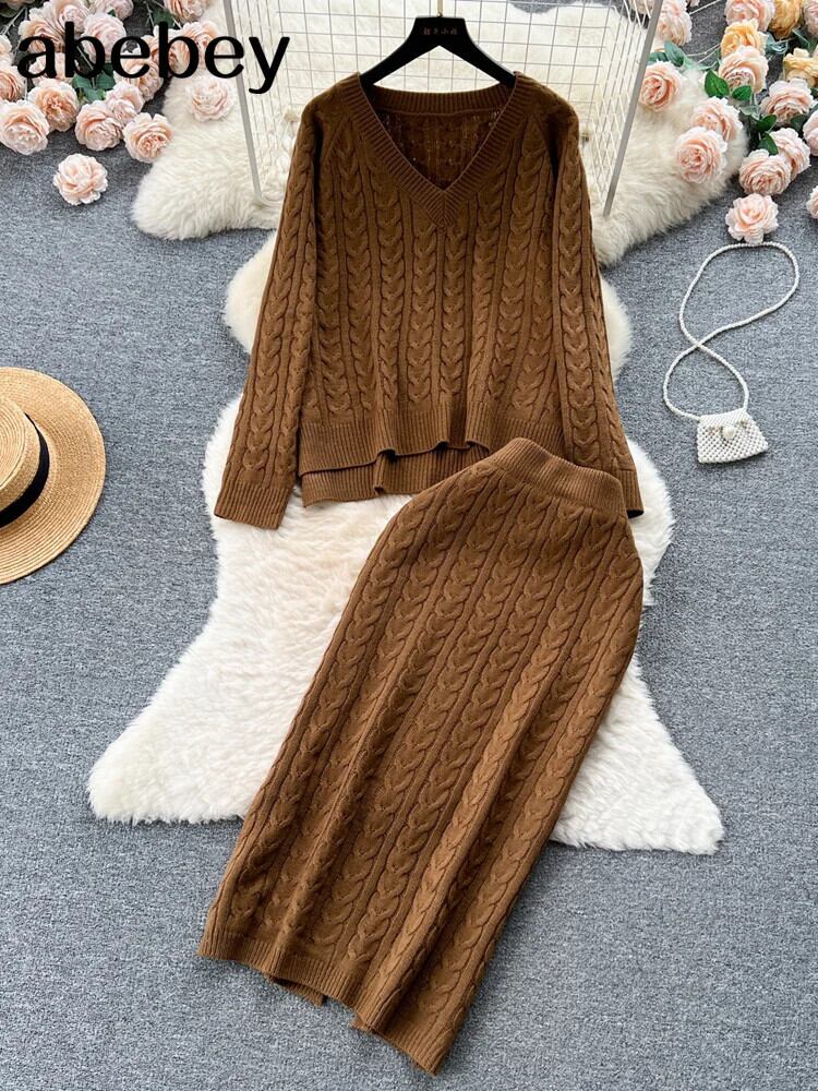 ニットツーピースセット冬長袖弾性ウエストトップルーズロングスカートフレンチ暖かいセータースーツ エラスティック 伸縮 ウィンター 冬物