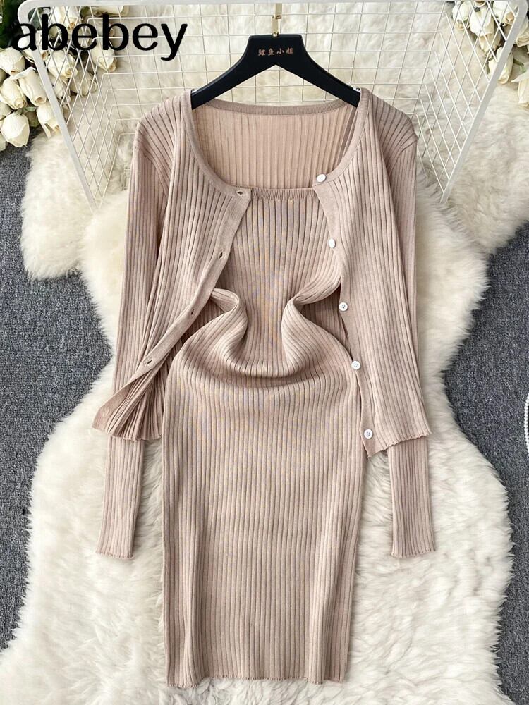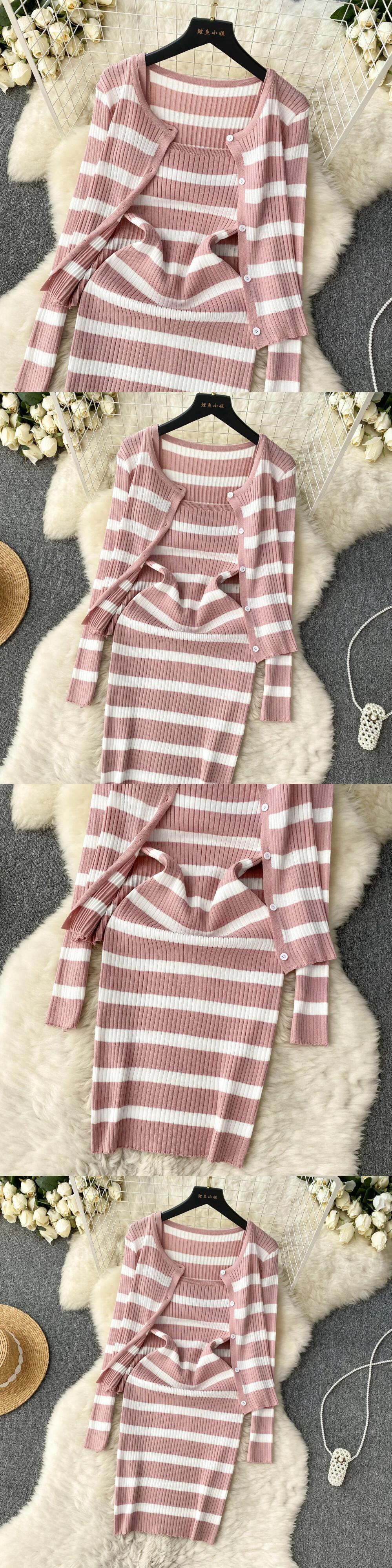 ニット 2 枚セットストライプ長袖キャディガンとストレッチボディコーンスリップドレスセット秋冬ペンシルドレス ロング オータム 秋物 ウィンター 冬物