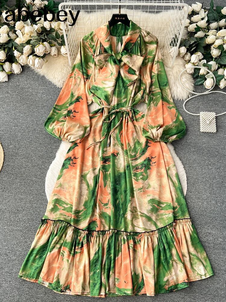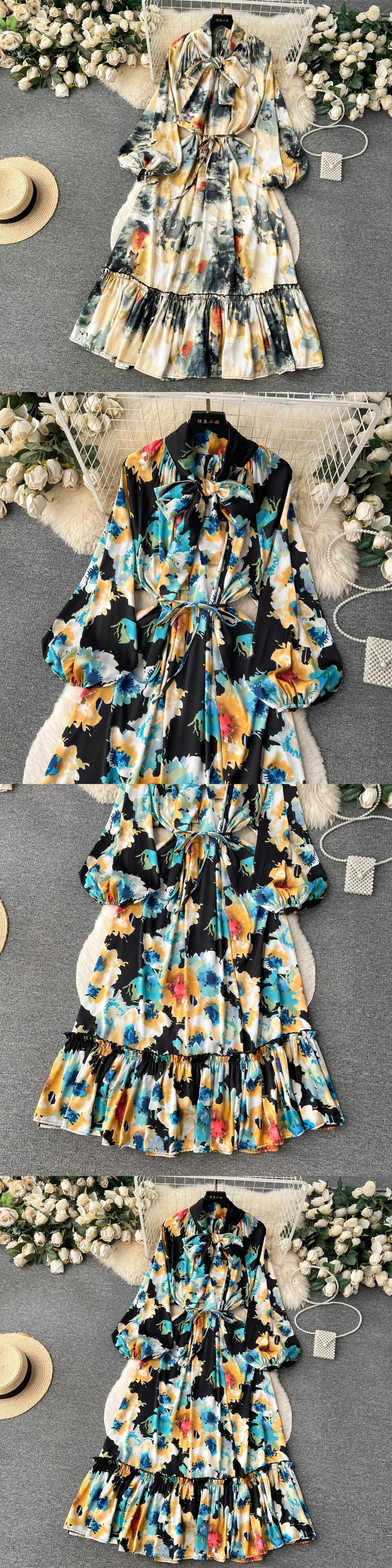 花柄ドレス秋長袖シフォン蝶ネクタイネックオフィスレディシャツドレス夏 Vestidos ロング リボン サマー 夏物 オータム 秋物 会社 学校 通勤や通学にも