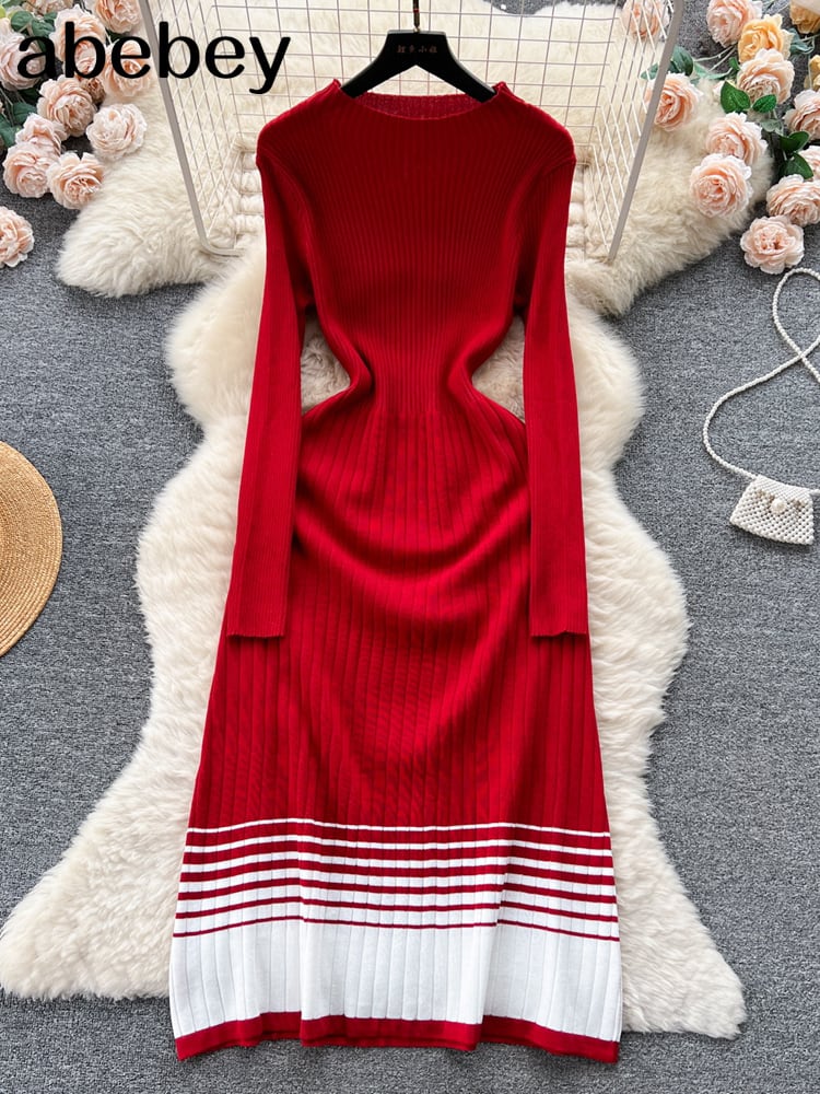 赤いパッチワークセータードレスストリップ O ネック長袖マキシロングドレス秋ストリートニット A ラインドレス レッド オータム 秋物 Oネック Aライン